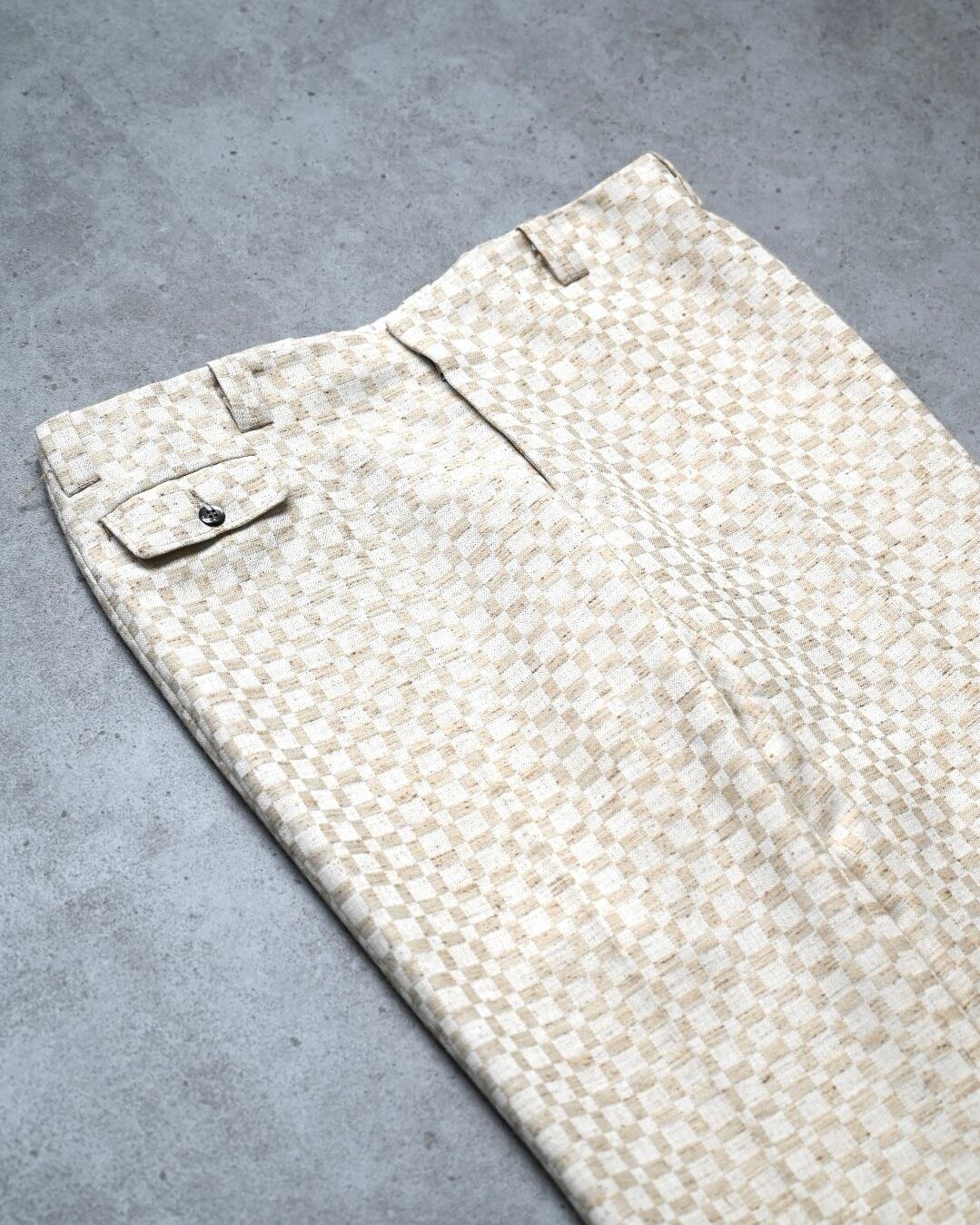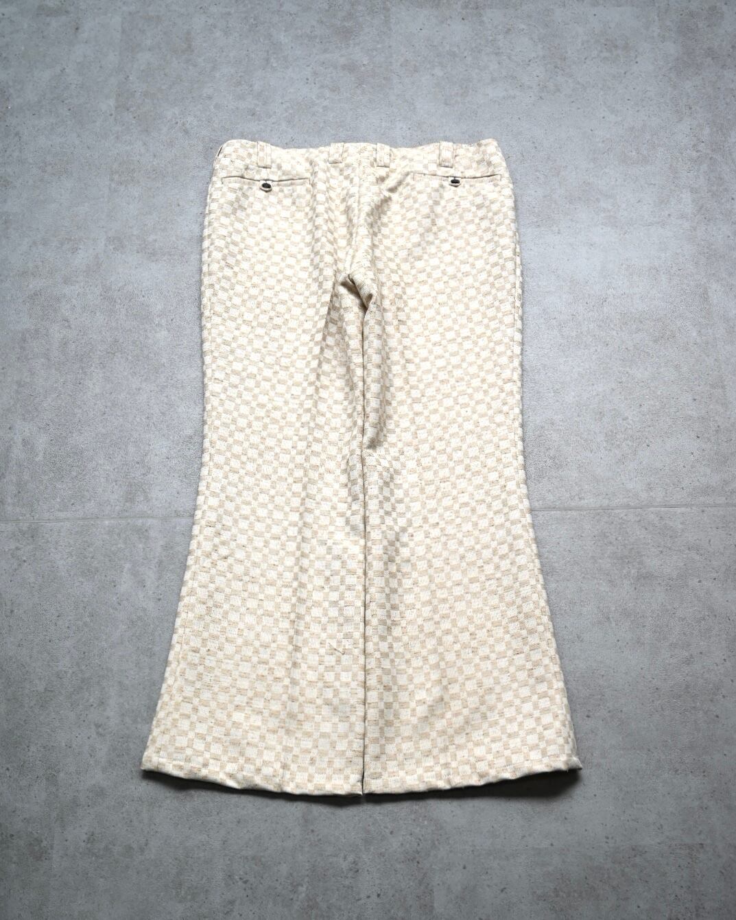 この年代らしいデザイン性の高いジャガード織でのブロックチェックパターンにゆったりとした腿幅から大きく広がるワイドフレアシルエットが印象的な一本。