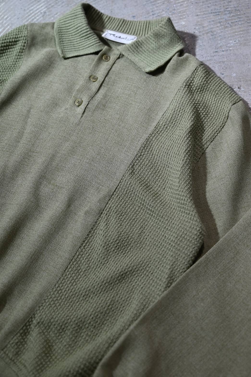 ワッフル調の切り替えと無地編みを組み合わせた、立体感のあるデザインニットポロ。