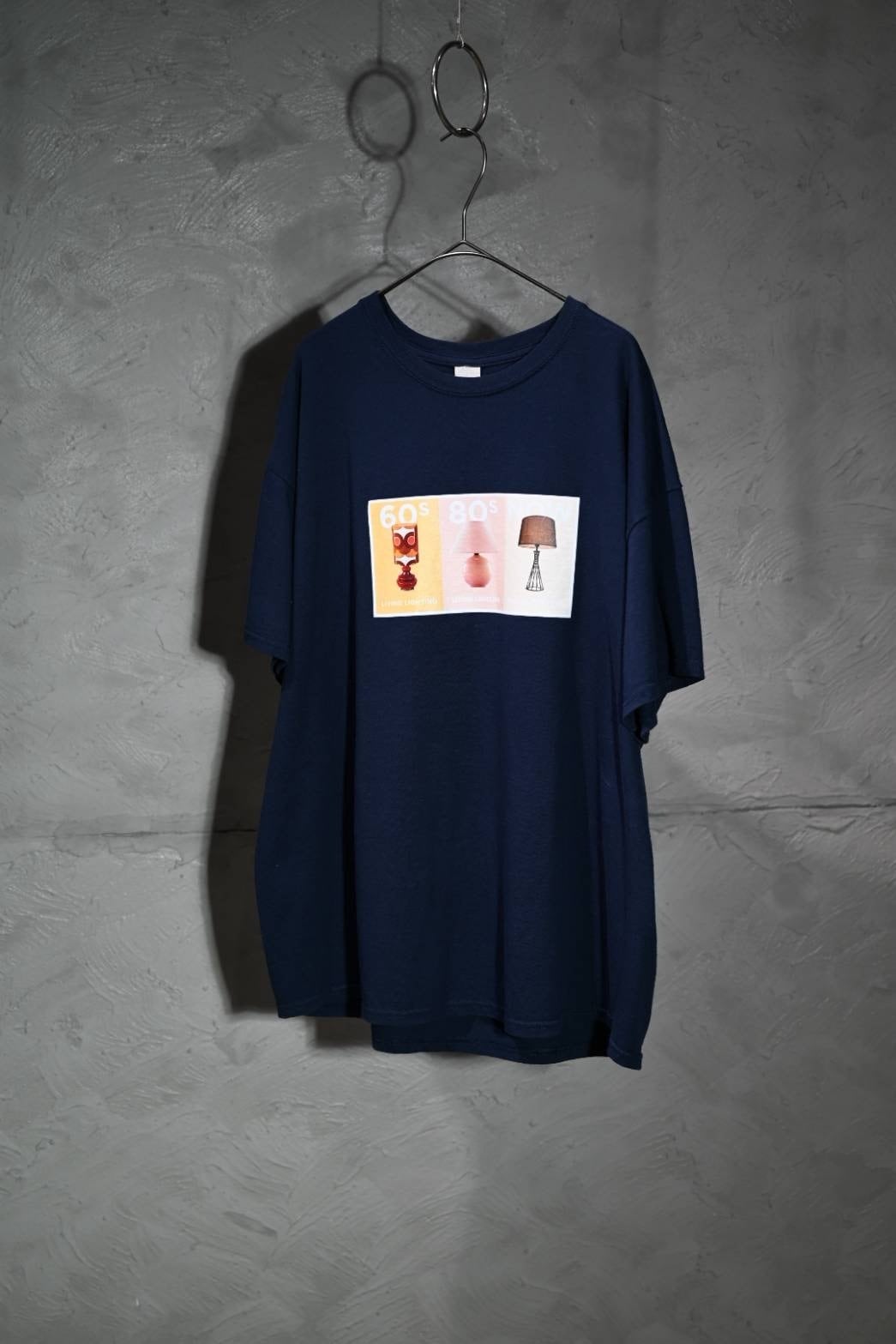 ネイビーボディにレトロな照明デザインが映える一枚。フロントには60s・80s・現代のランプを並べたユーモラスなグラフィック。