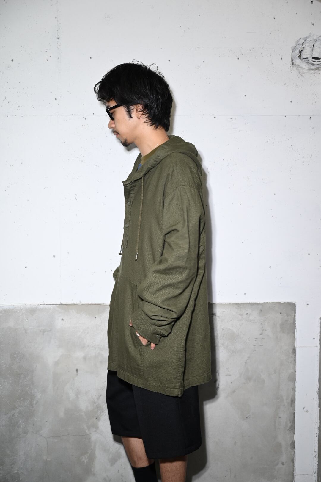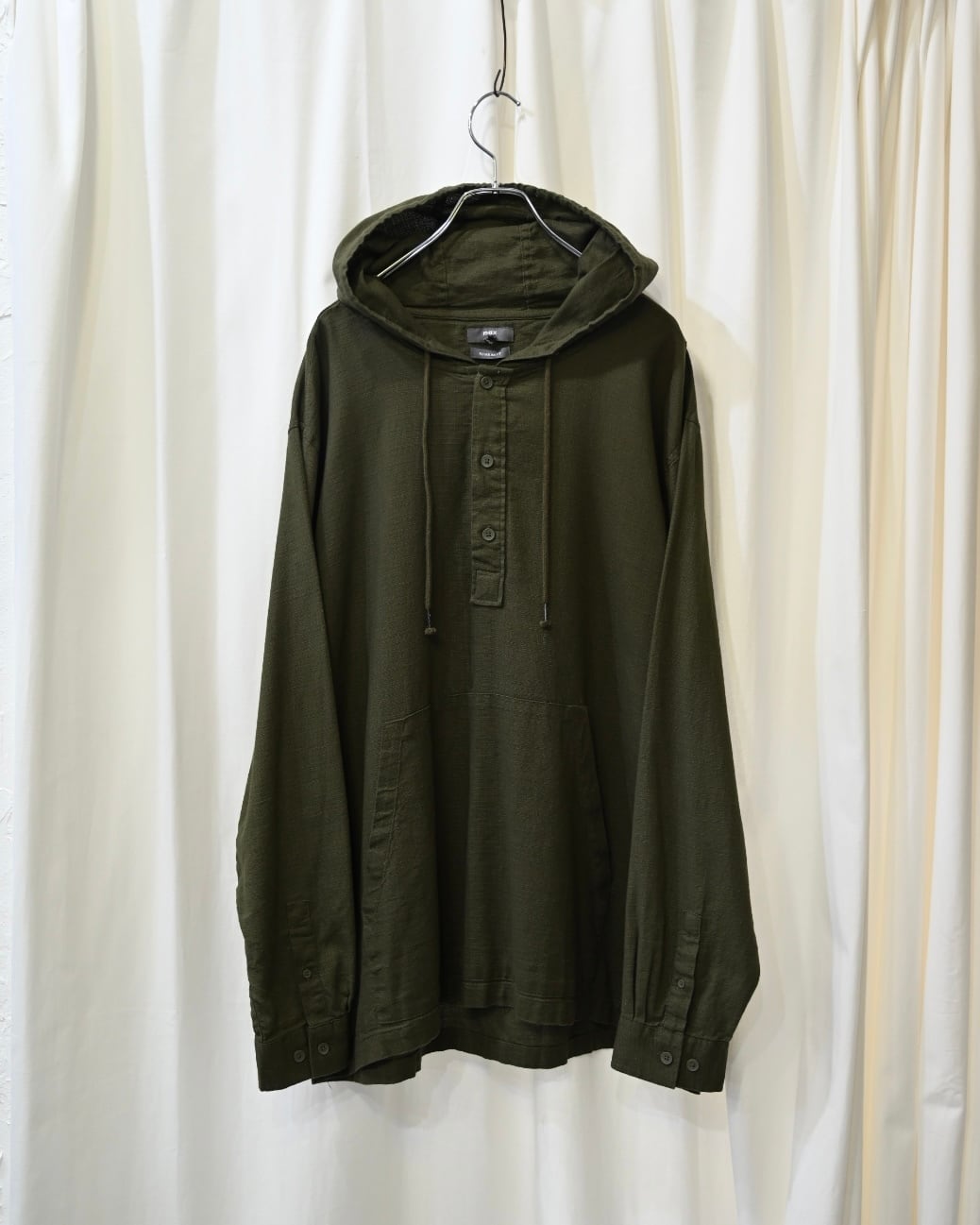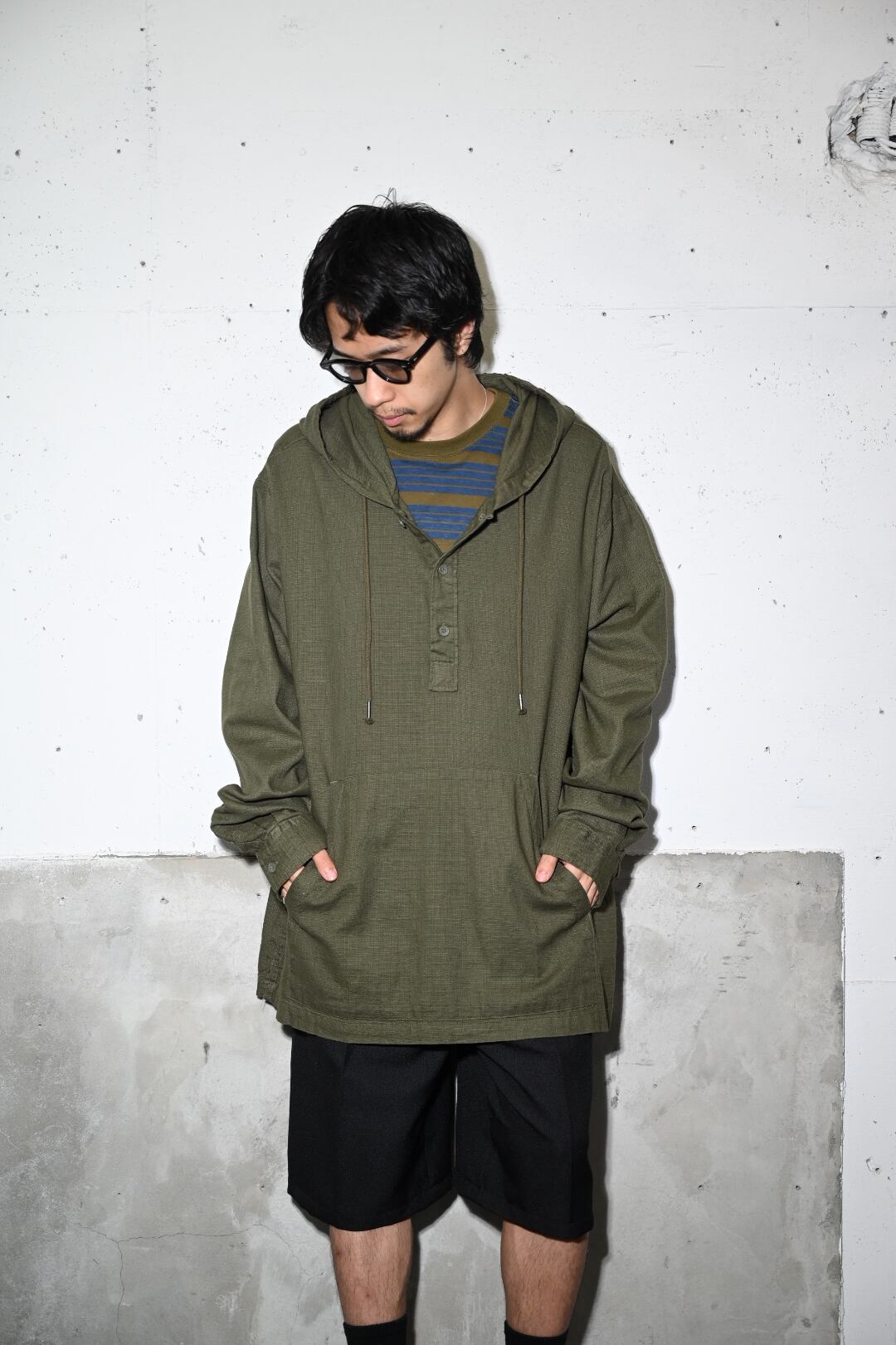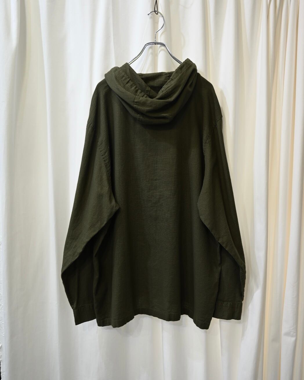 色目の深いオリーブカラーにリラックス感のあるサイズバランスのプルオーバーシャツフーディ。