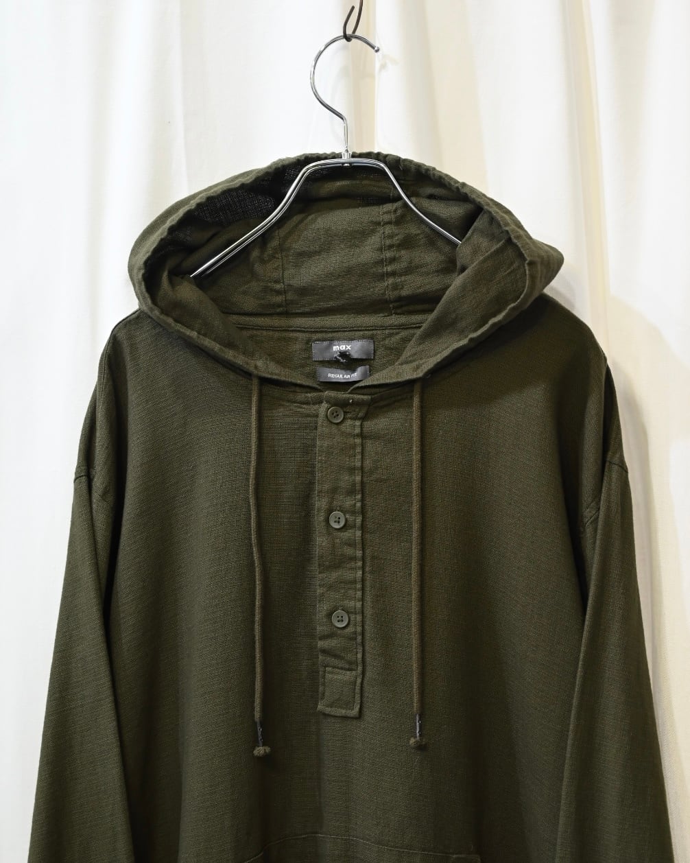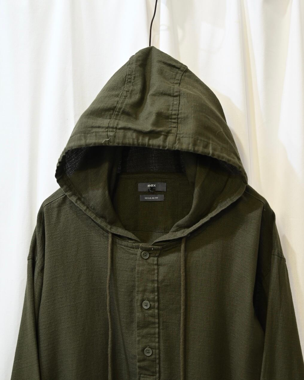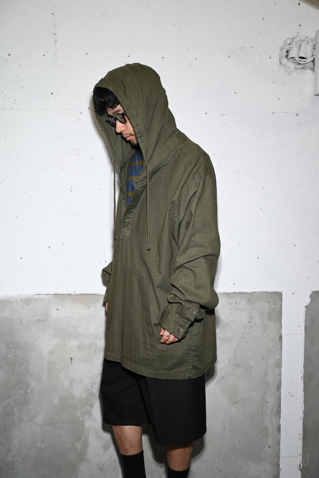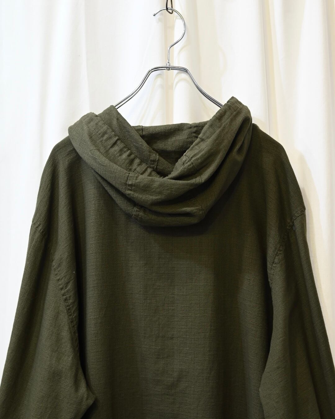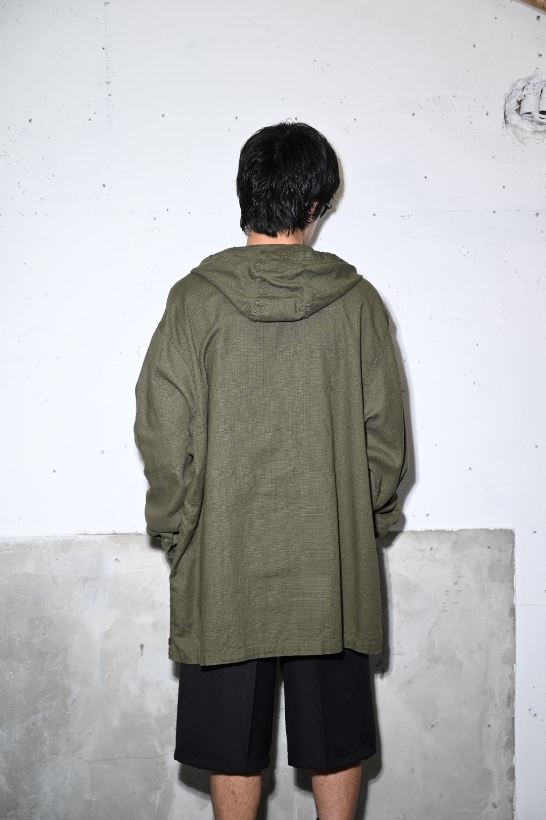 色目の深いオリーブカラーにリラックス感のあるサイズバランスのプルオーバーシャツフーディ。