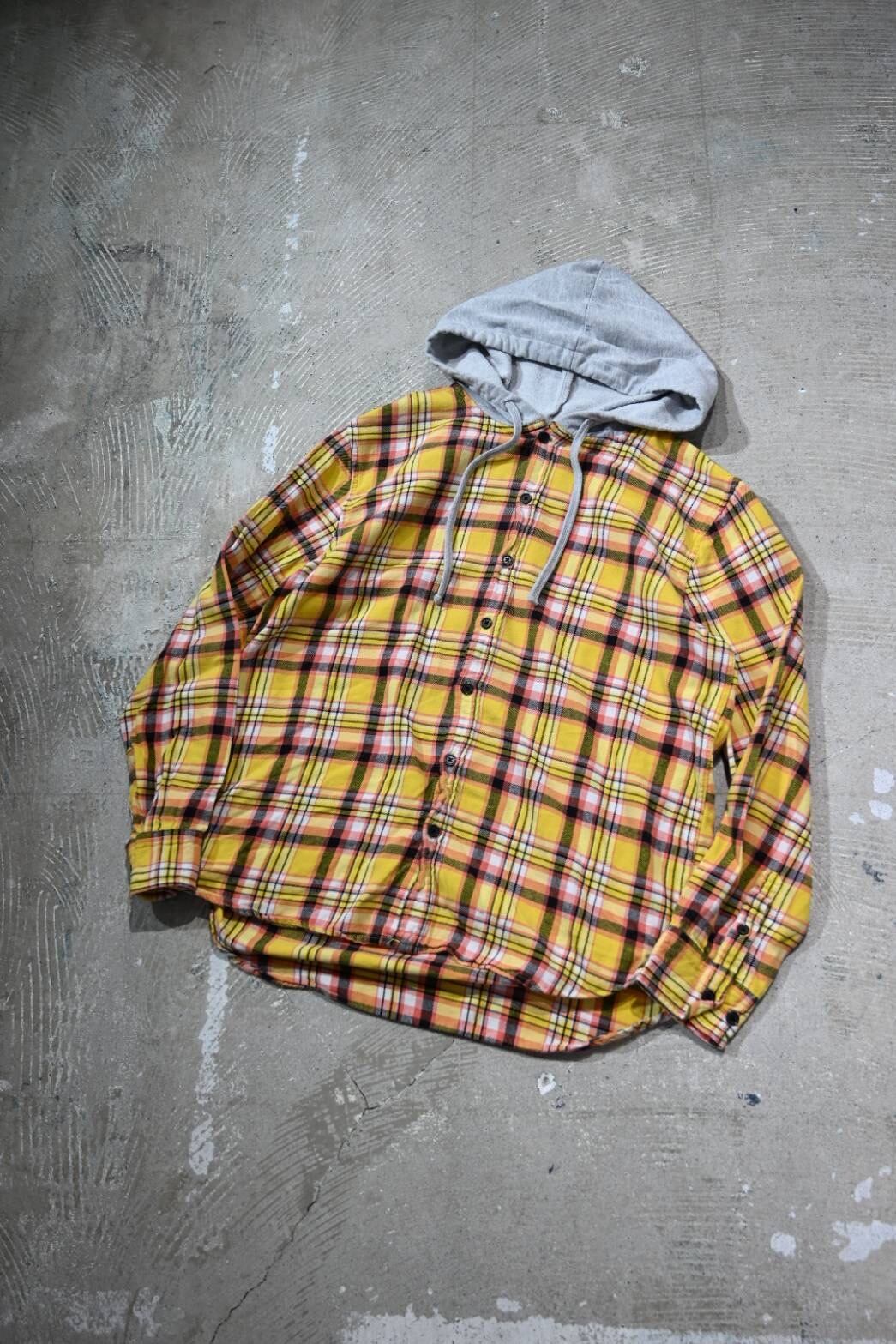 グレーカラーのスウェットフーディがドッキングされたデザインで、シャツとパーカーを重ね着したようなレイヤード感を一枚で楽しめます。