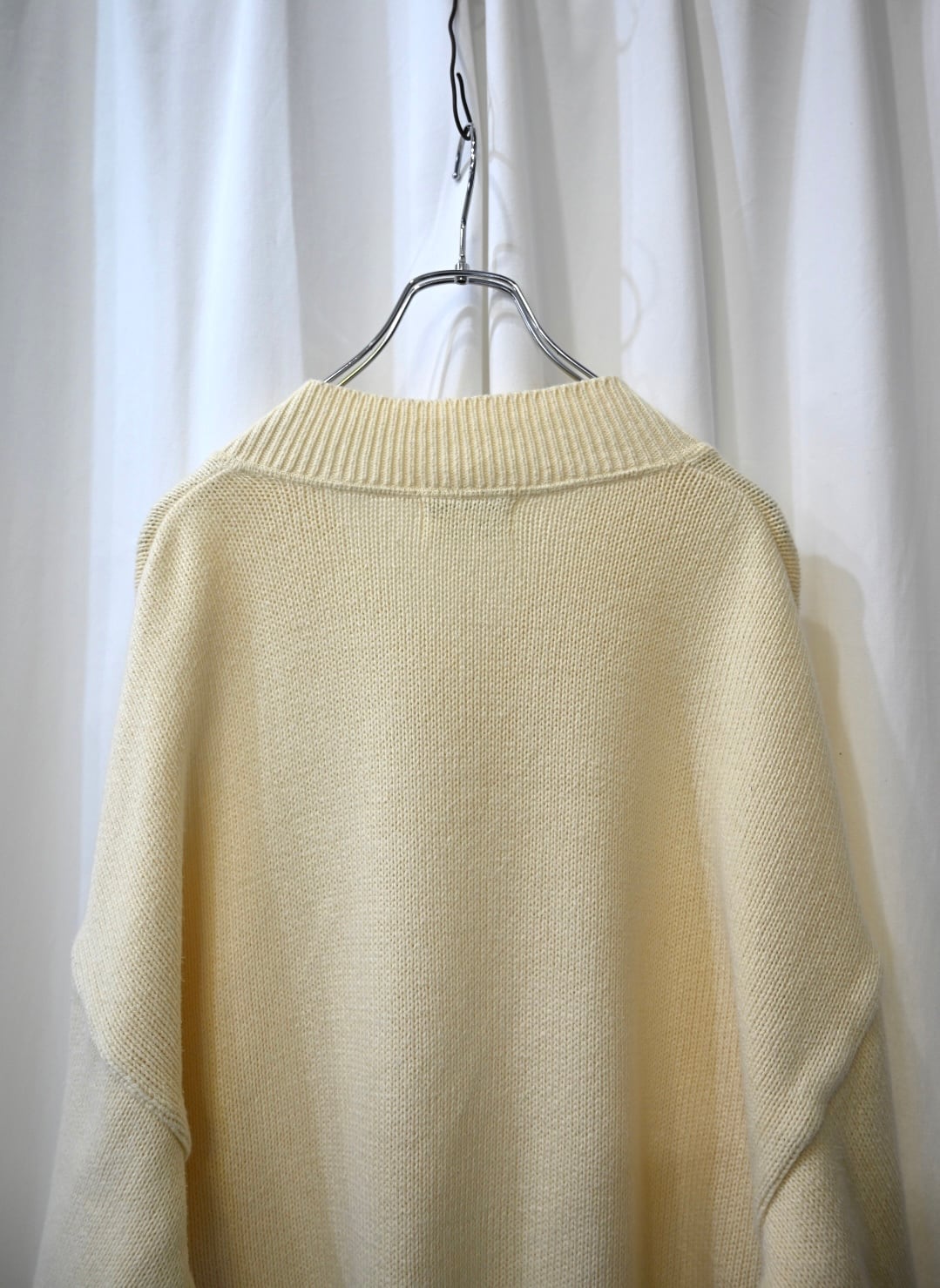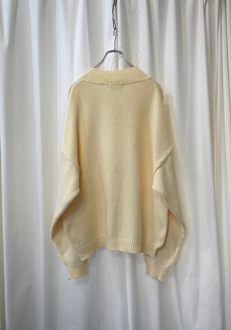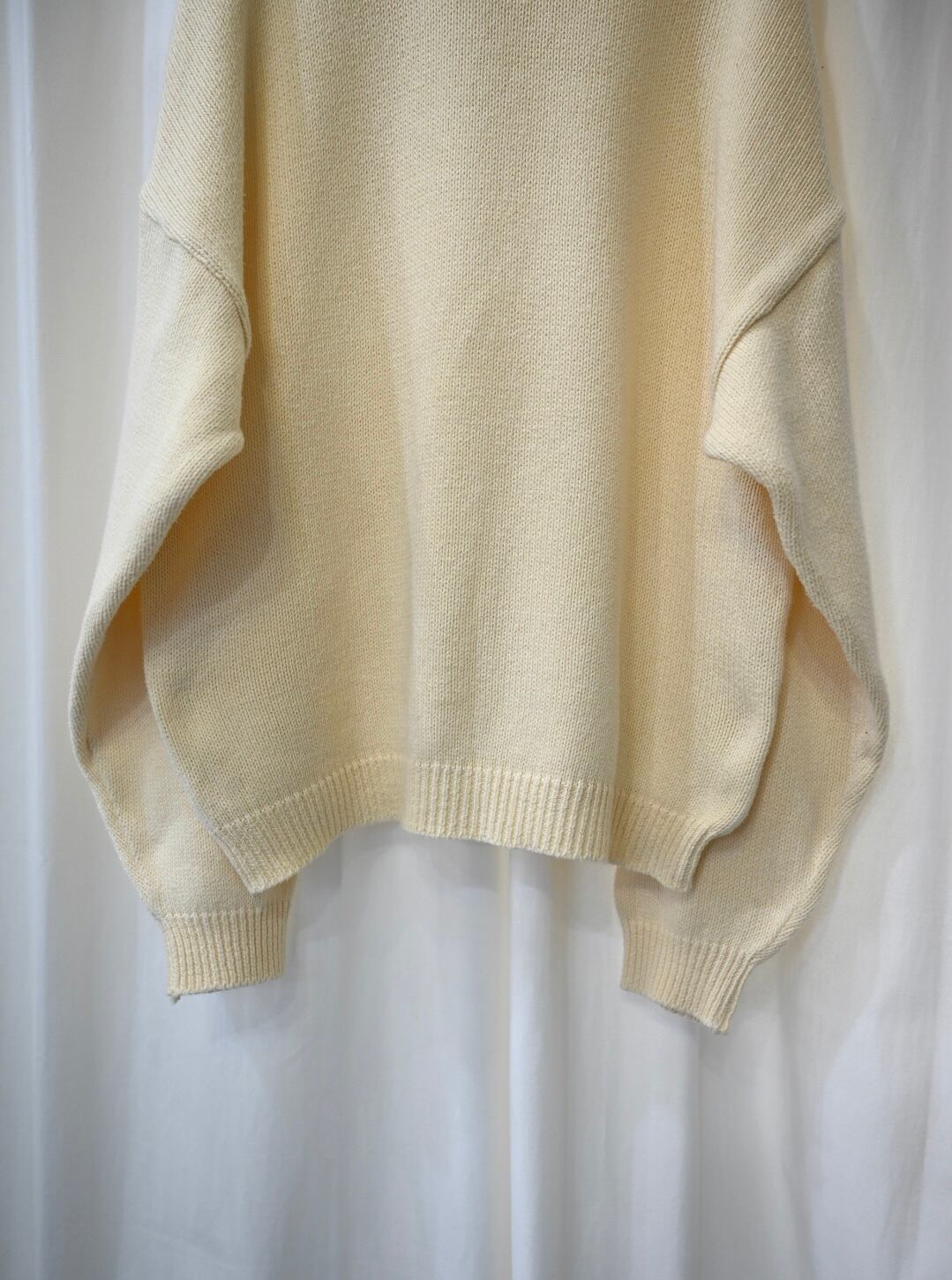 ドロップショルダーと広めの身幅が生み出すリラックス感のあるシルエットと生成りがかったナチュラルなカラーリングで、一枚で主役としても、シャツやロンTとのレイヤードにも使いやすい万能な一着。