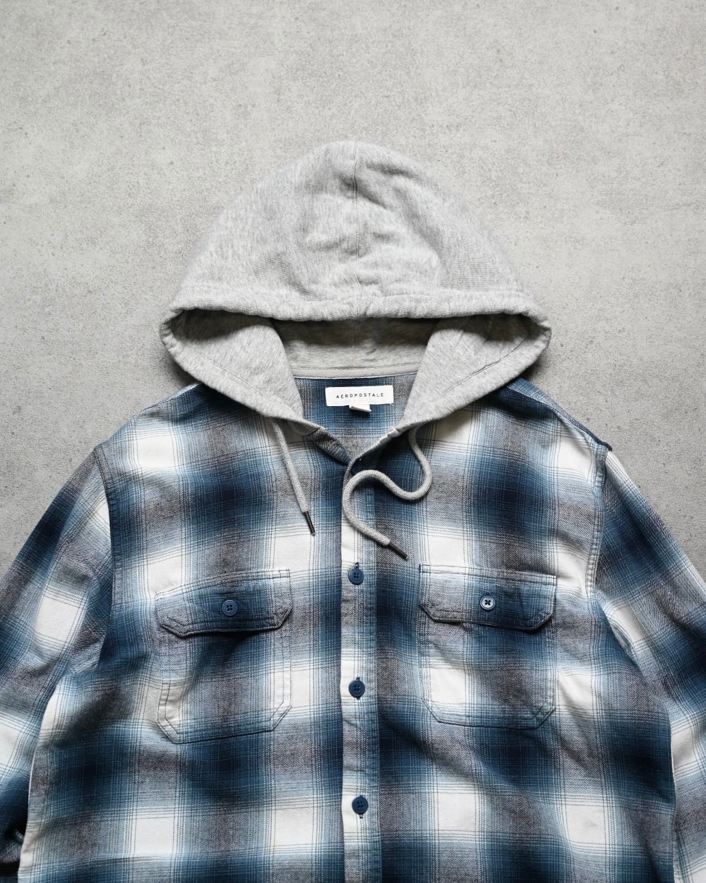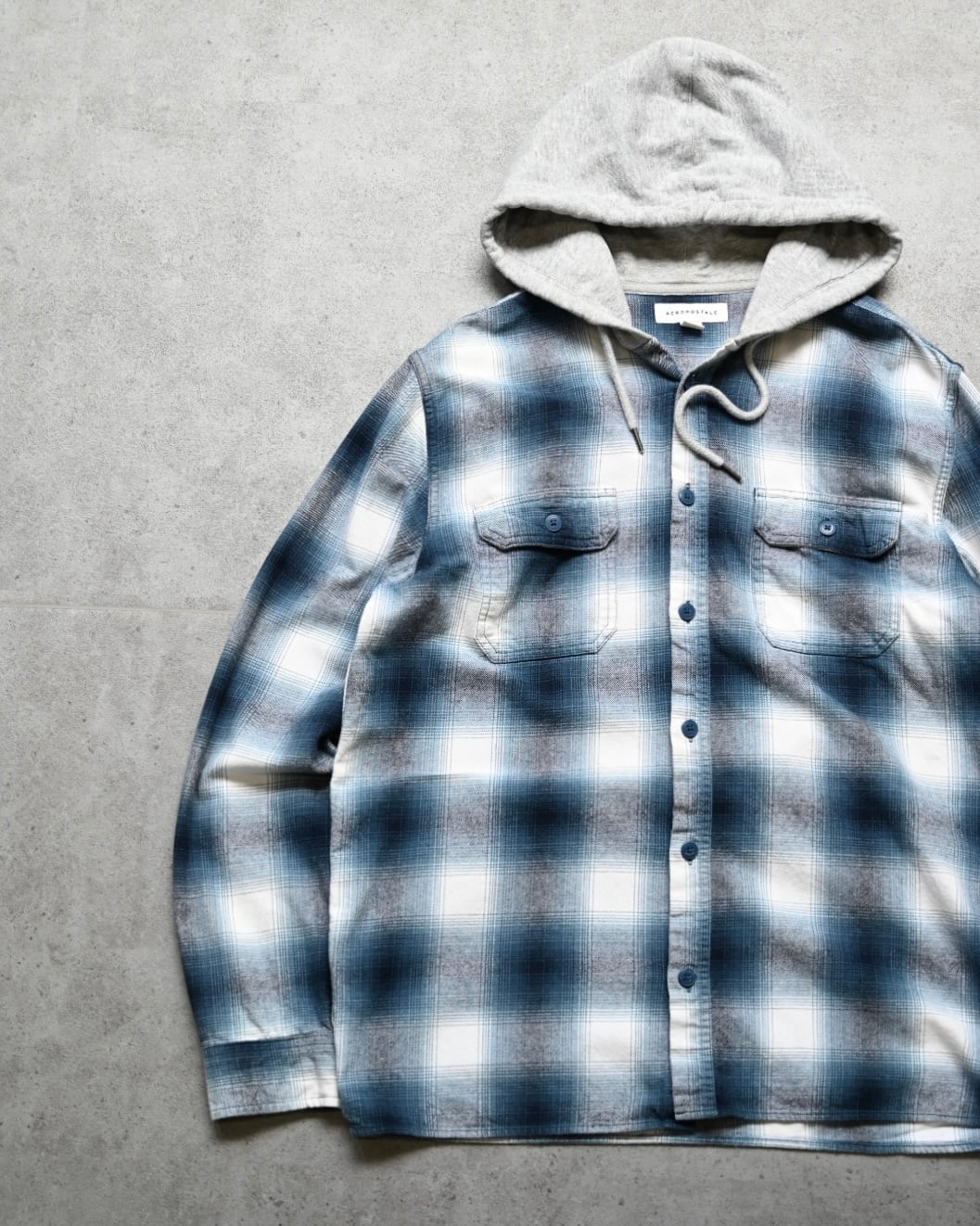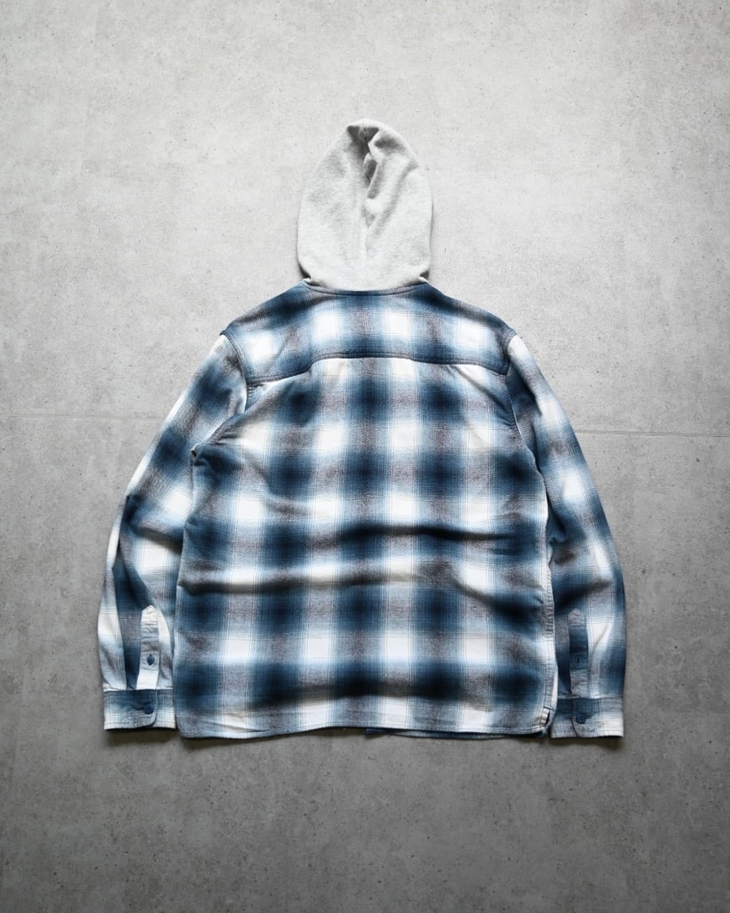 フードをレイヤードした様な一体型フーデットシャツデザインにブルー×ホワイトの高配色チェックパターン。