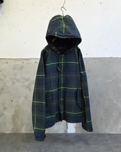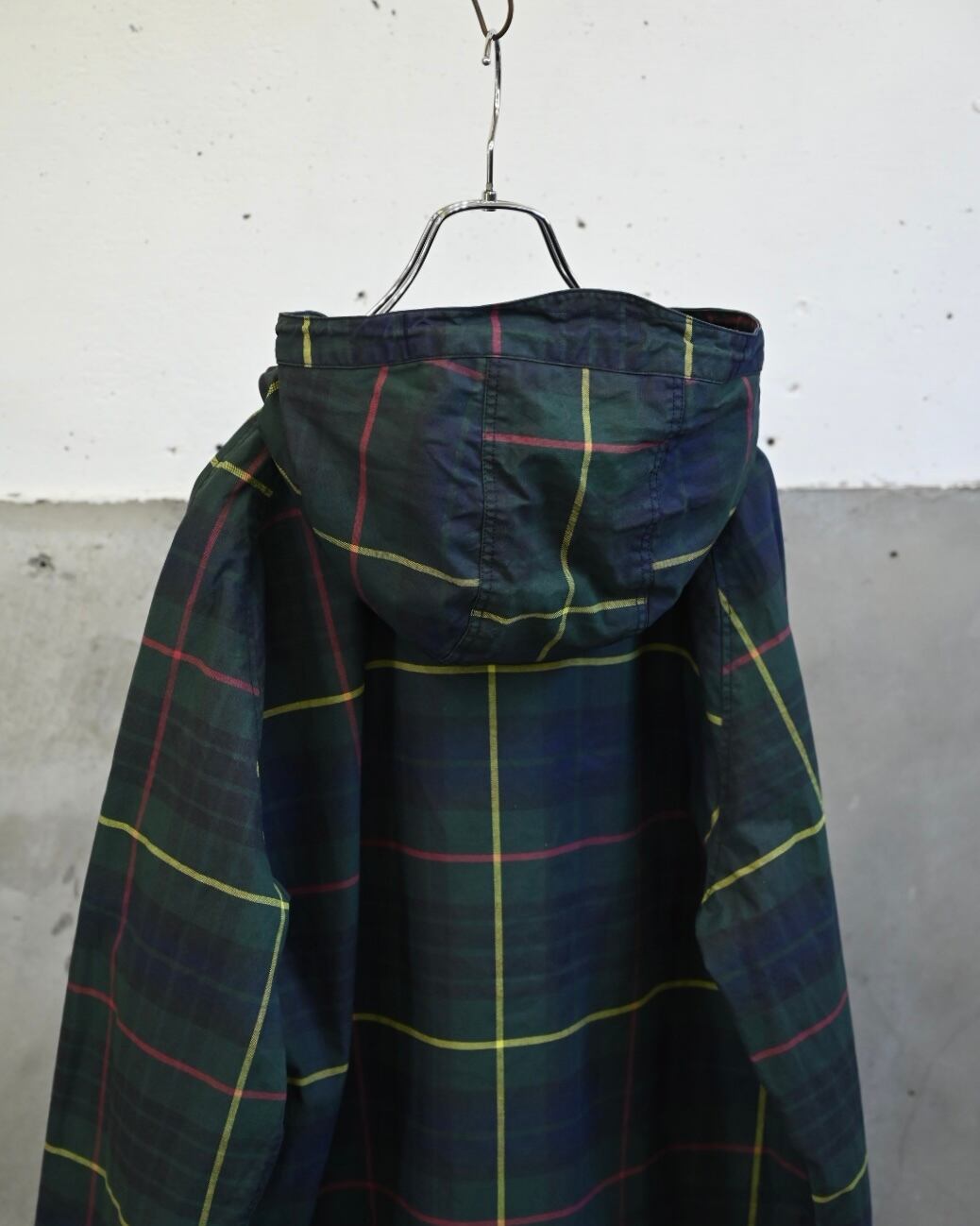 コーティング加工によるオイルドジャケットの様なハリのある肉厚でしっとりとした生地感のタータンチェックパターンフーデッドジャケット。