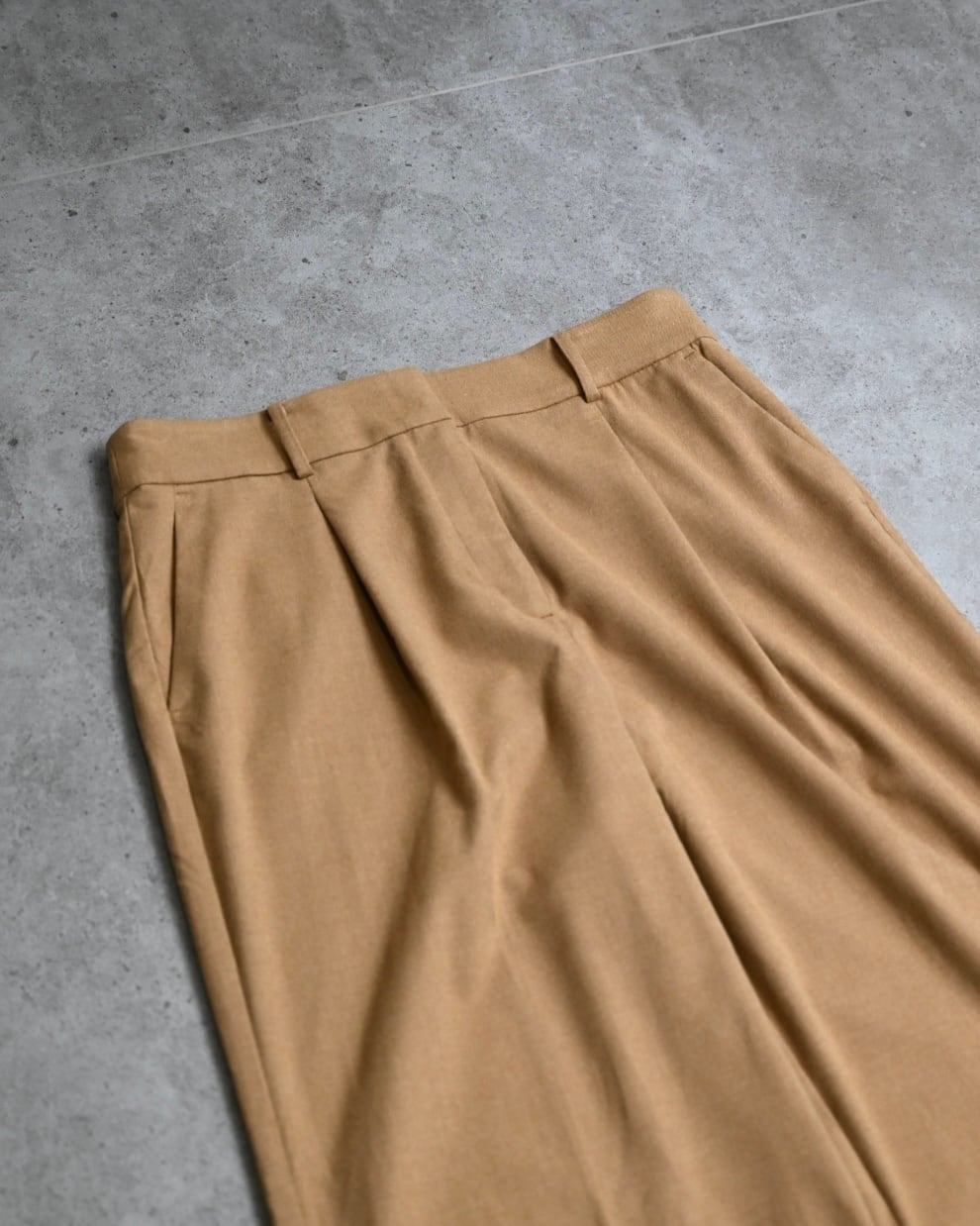 裾にかけてまっすぐストンとワイドに落ちるシルエット感や伸縮性にも優れたライトな生地感も魅力的◎