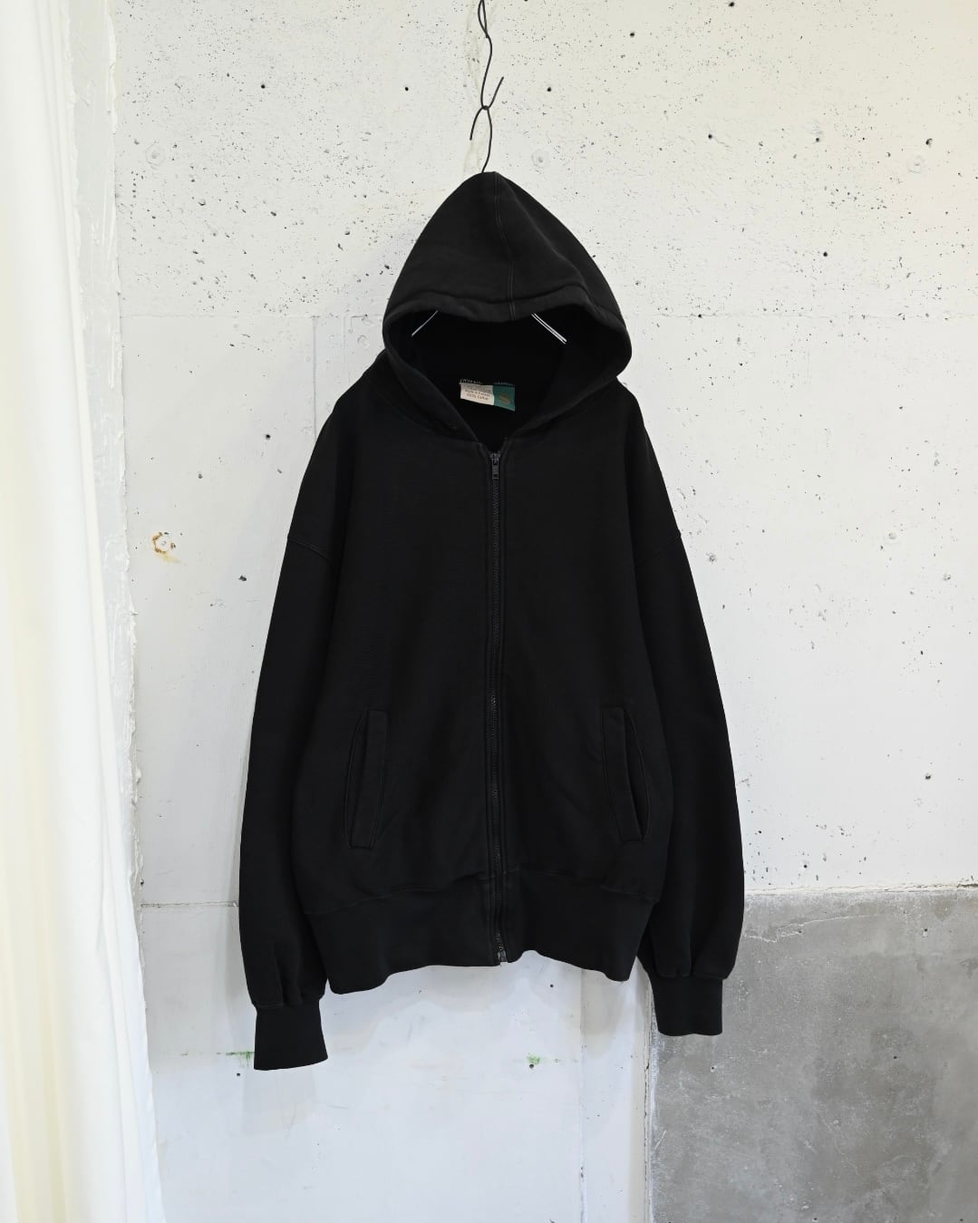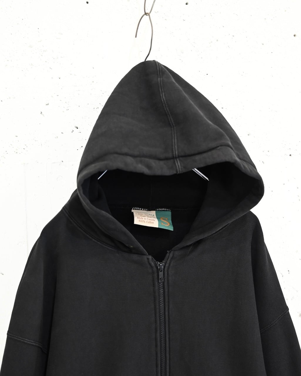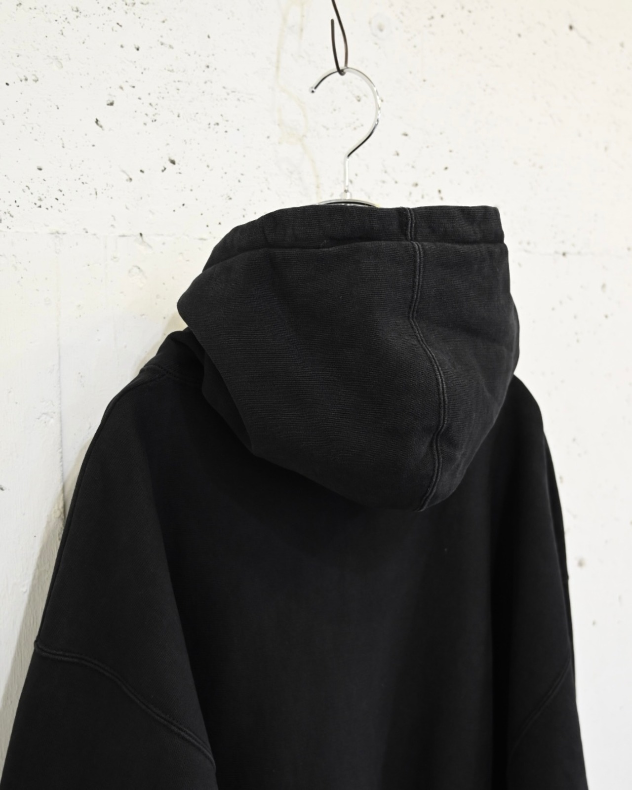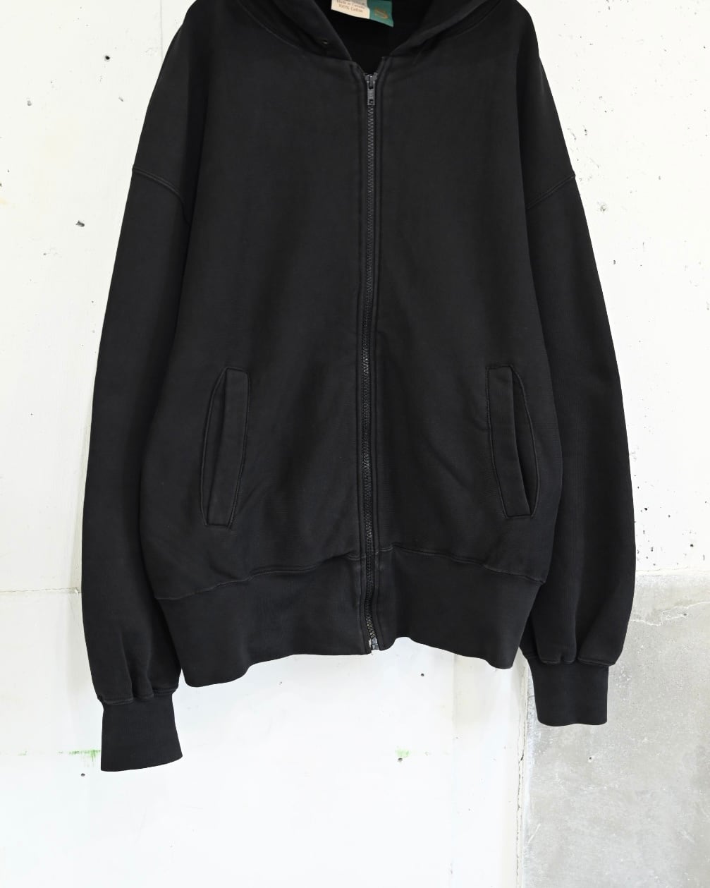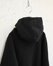 超大振りに設定されたアームホール、長めの裾リブなど普通のジップアップパーカーとは良い意味で違和感を覚える個体。