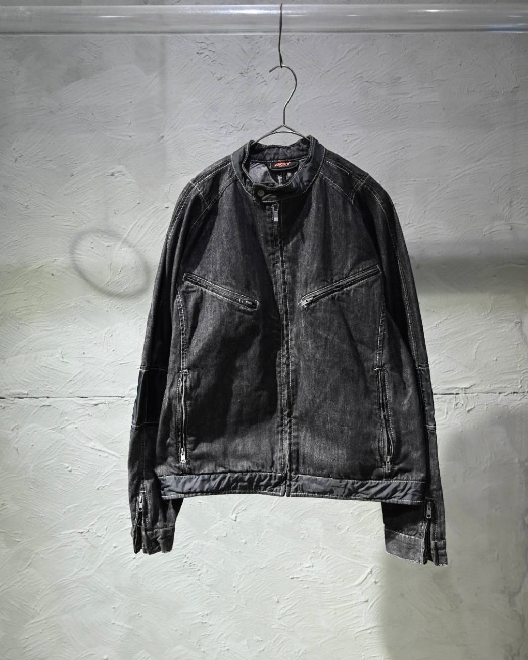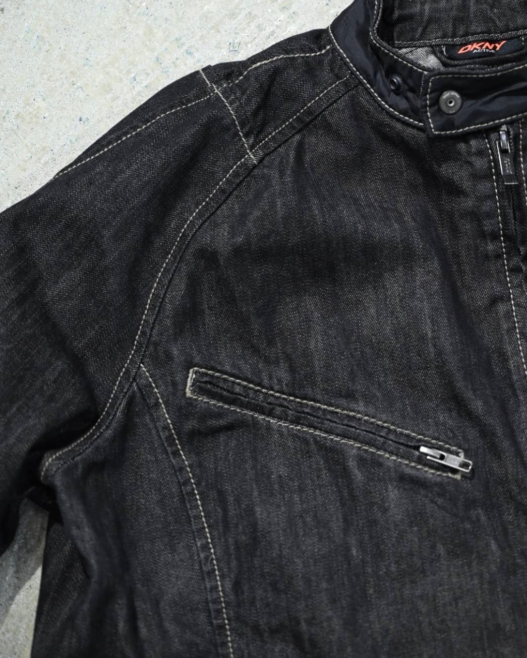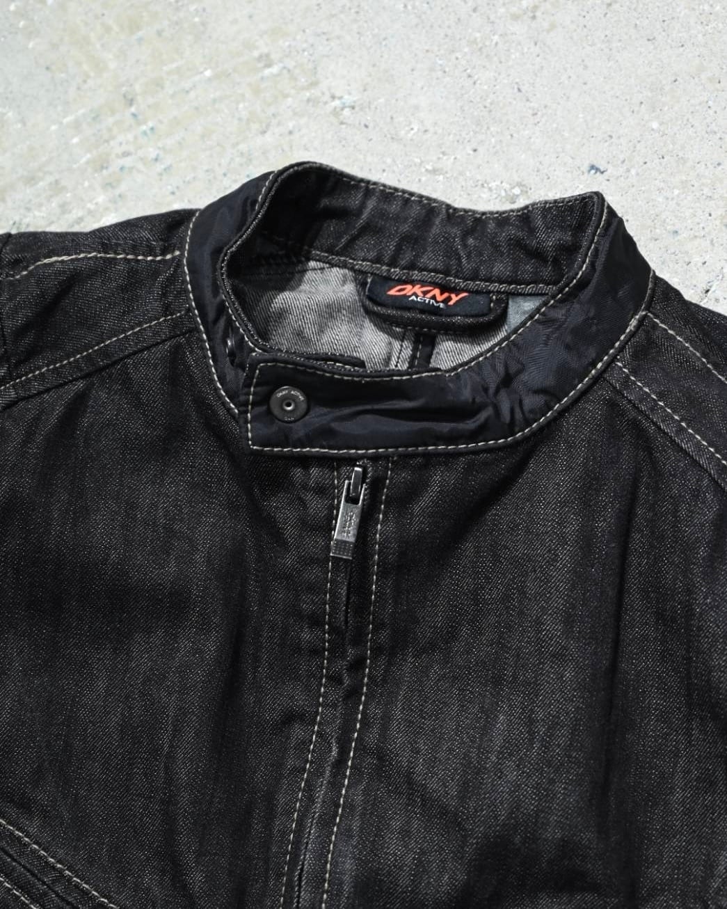 DKNYらしいアーバンなムードが際立つ、切り替えデザインのブラックデニムジャケット。