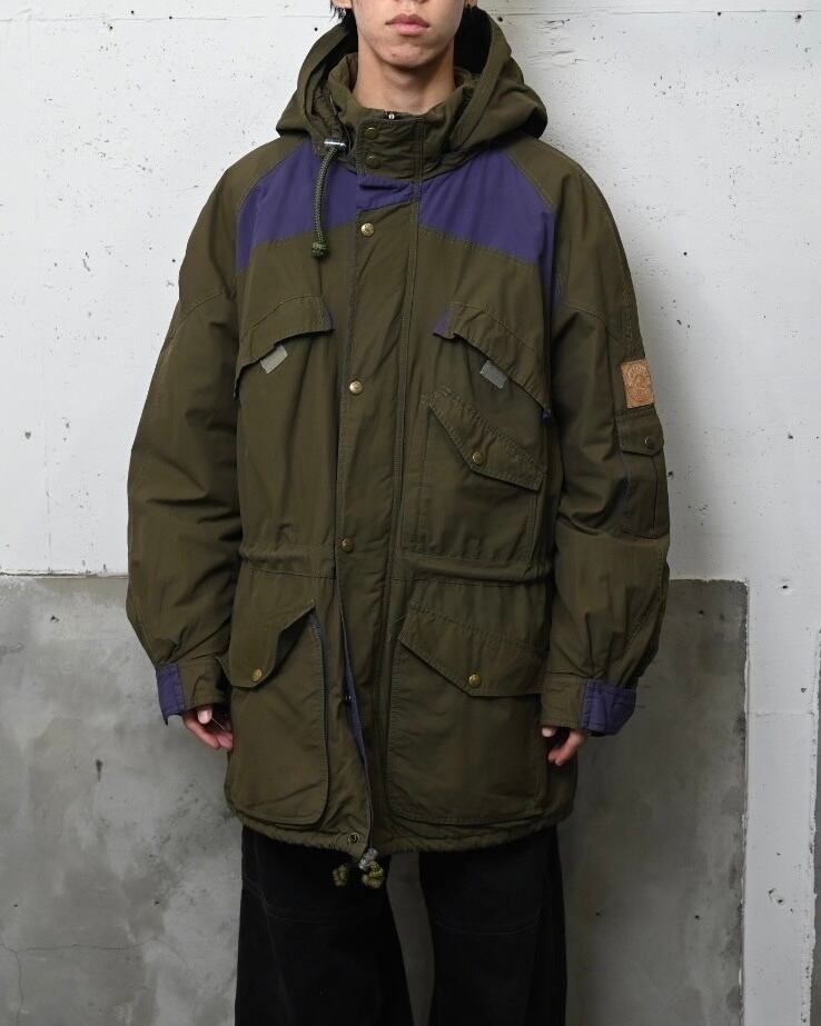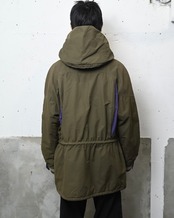 オリーブボディをベースに、肩から胸にかけてパープルの切り替えを施したスイッチングデザインが特徴的な一着。