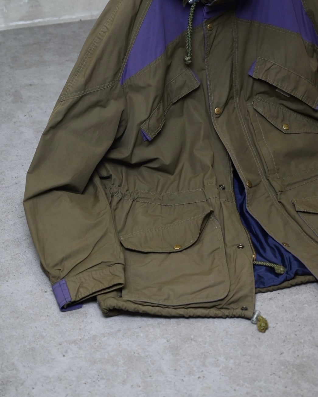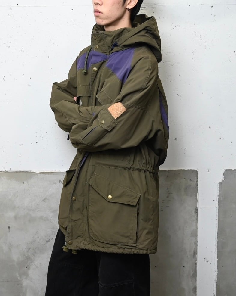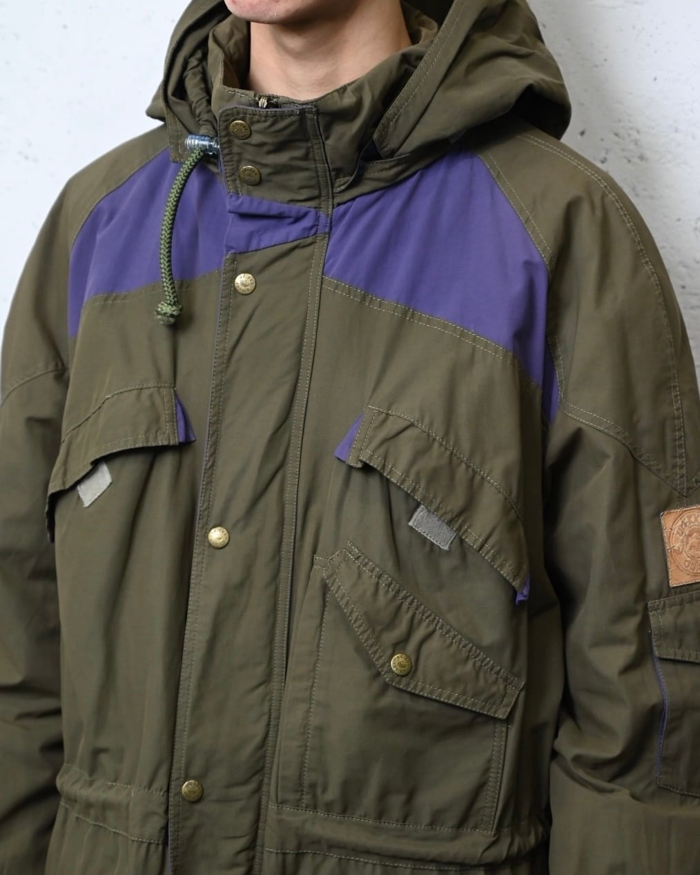 オリーブボディをベースに、肩から胸にかけてパープルの切り替えを施したスイッチングデザインが特徴的な一着。
