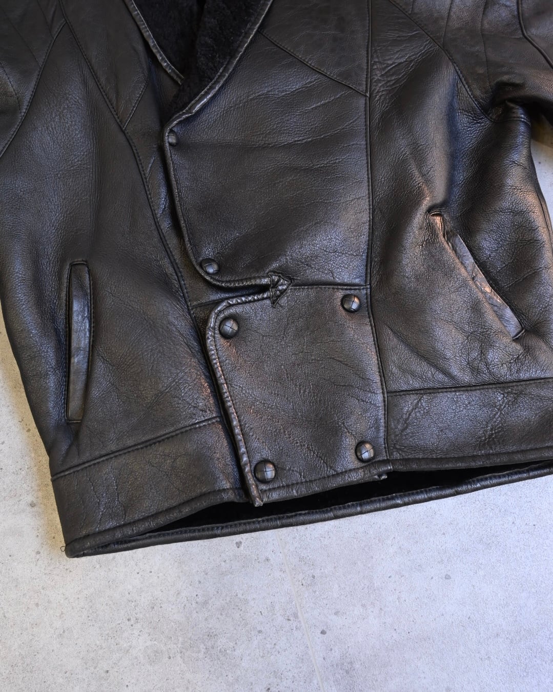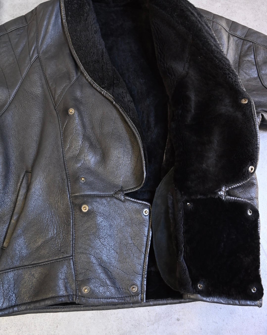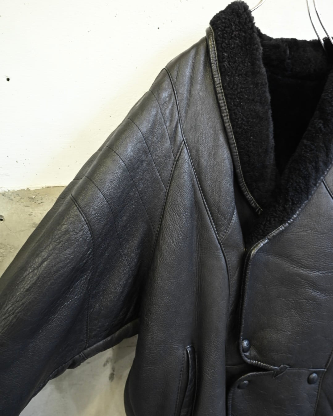 肉厚なレザーに、内側は全面ボア仕様のシアリングレザージャケット。