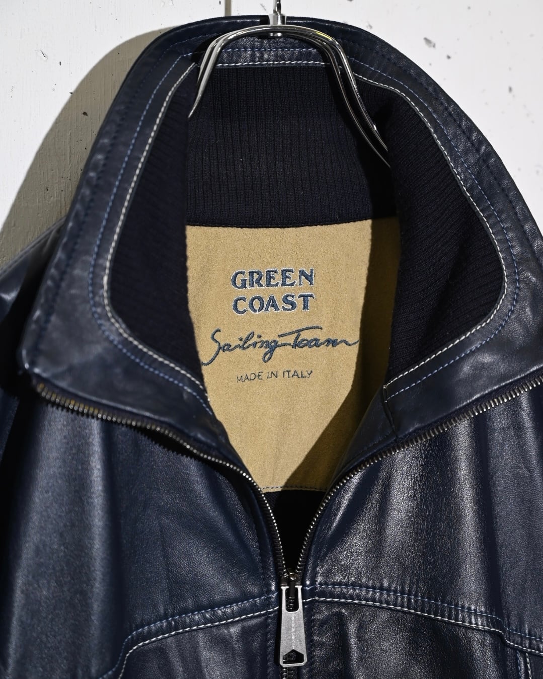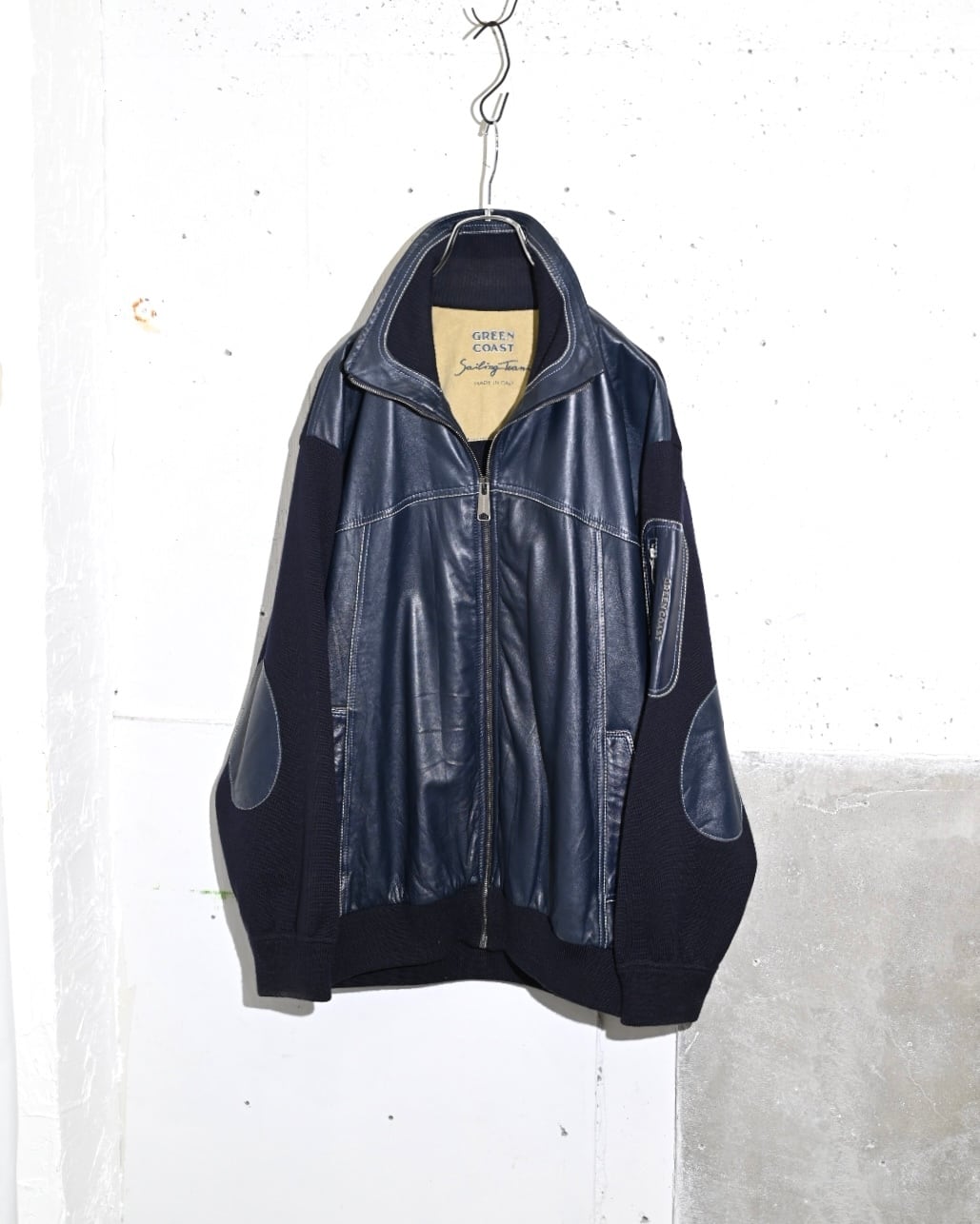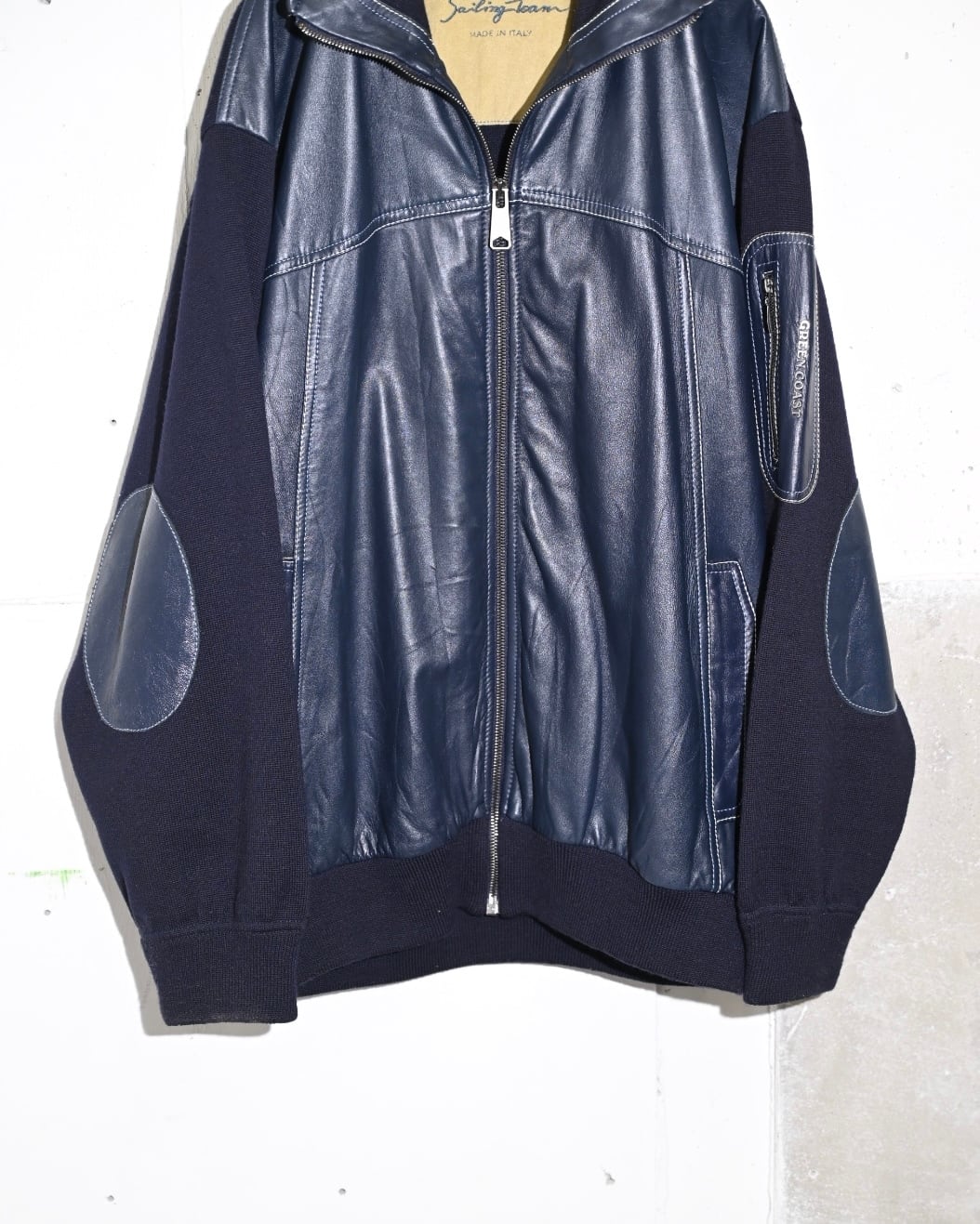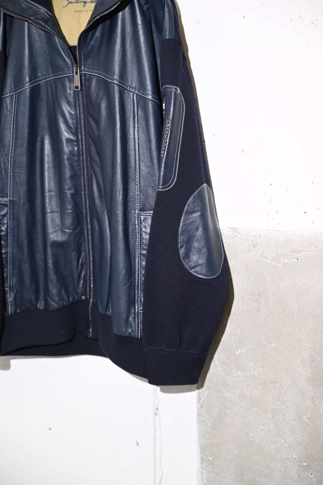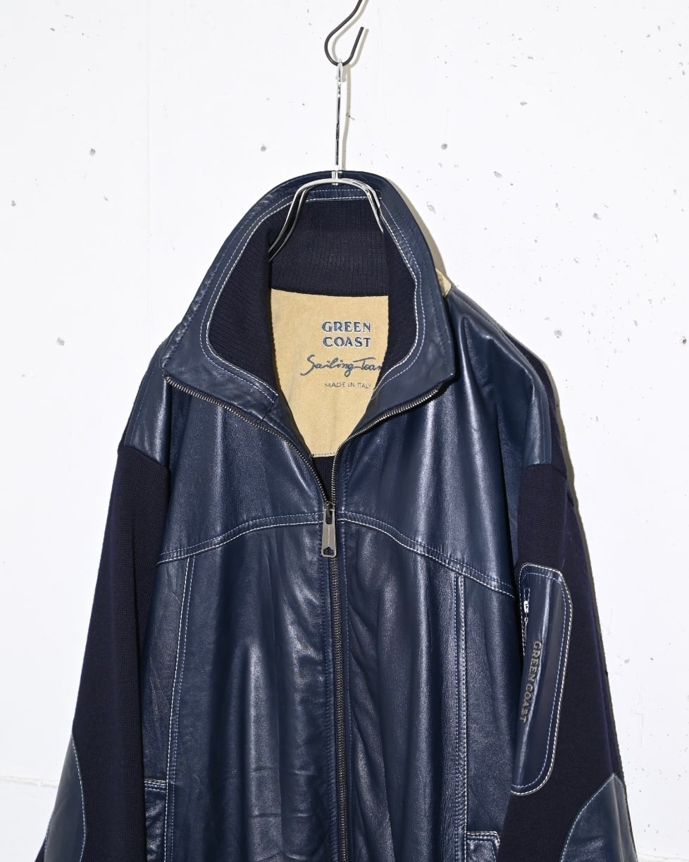 イタリア製らしい配色のバランスに柔らかなレザーと肌触りの良いニットでの切り替えデザインジャケット。