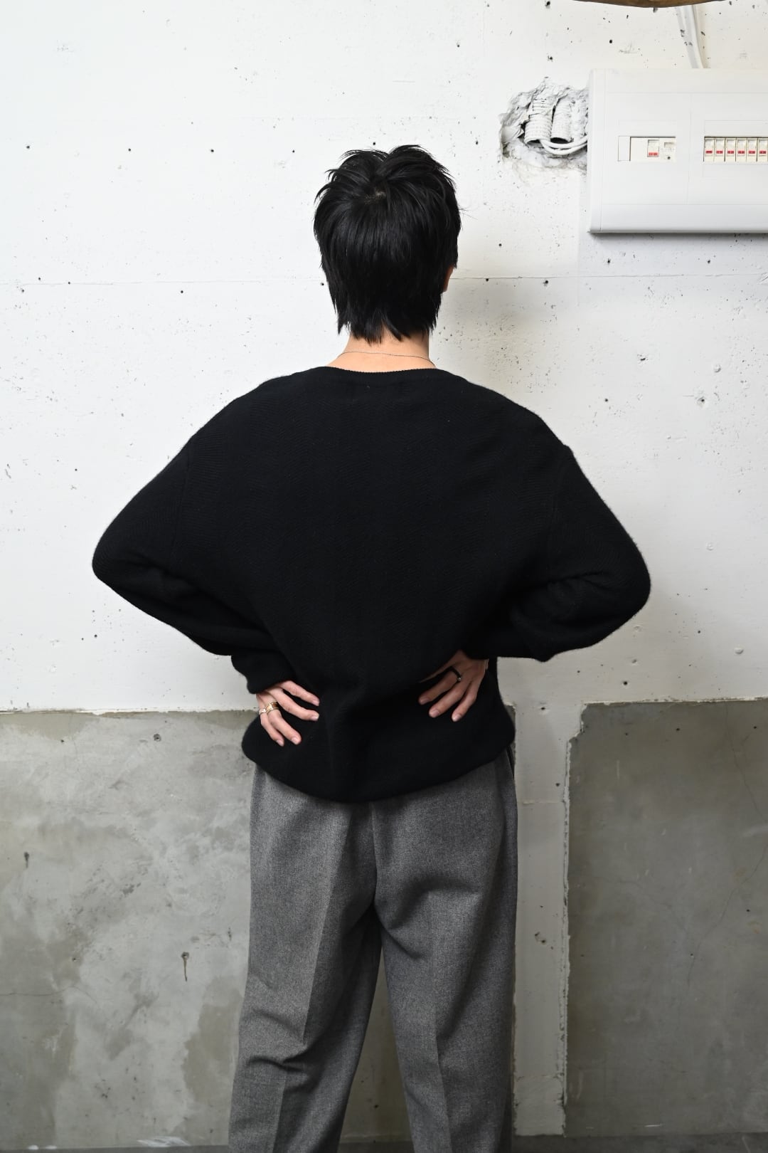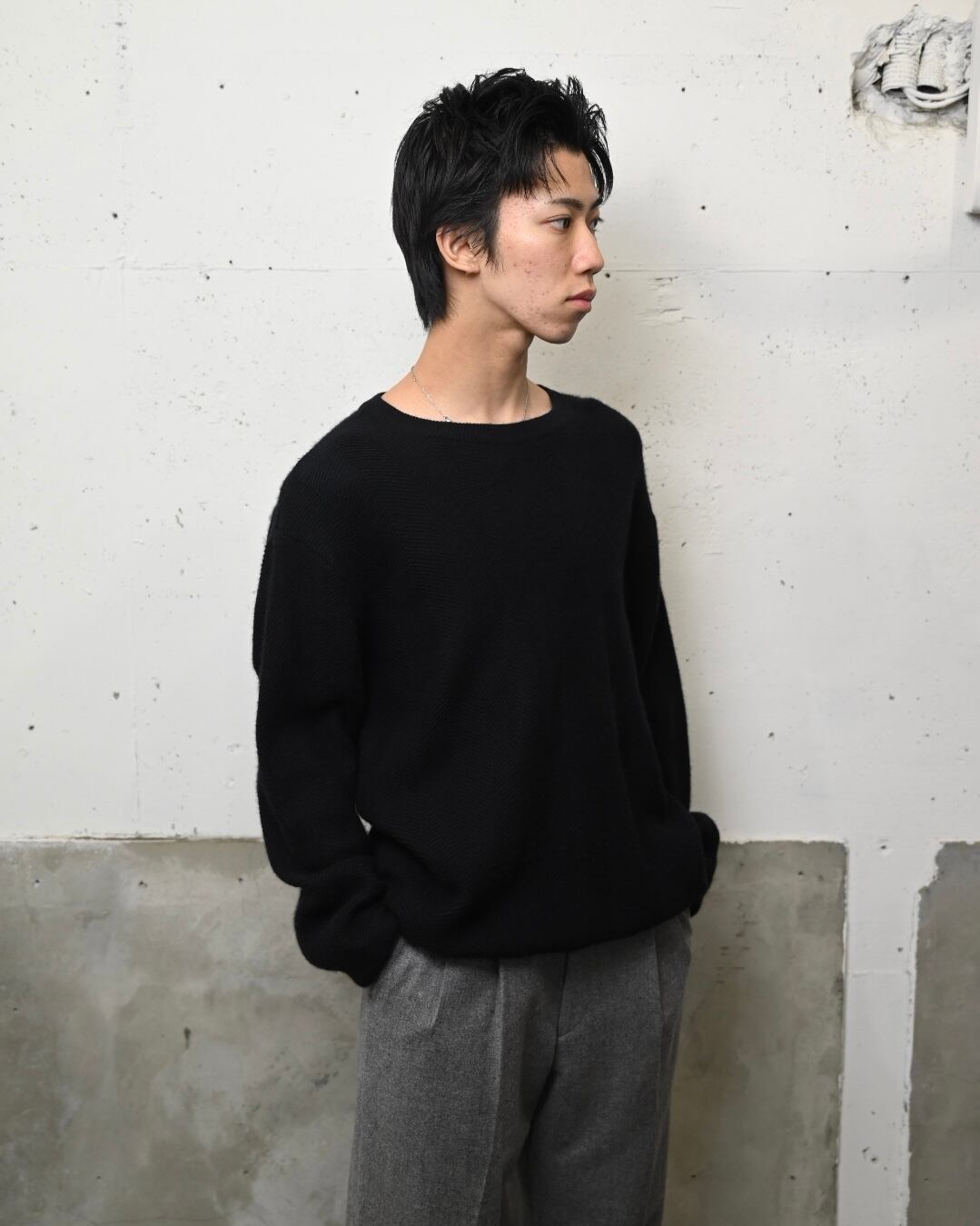 緩く設定された首元、リブへ自然に溜まるややルーズなシルエット感も◎
