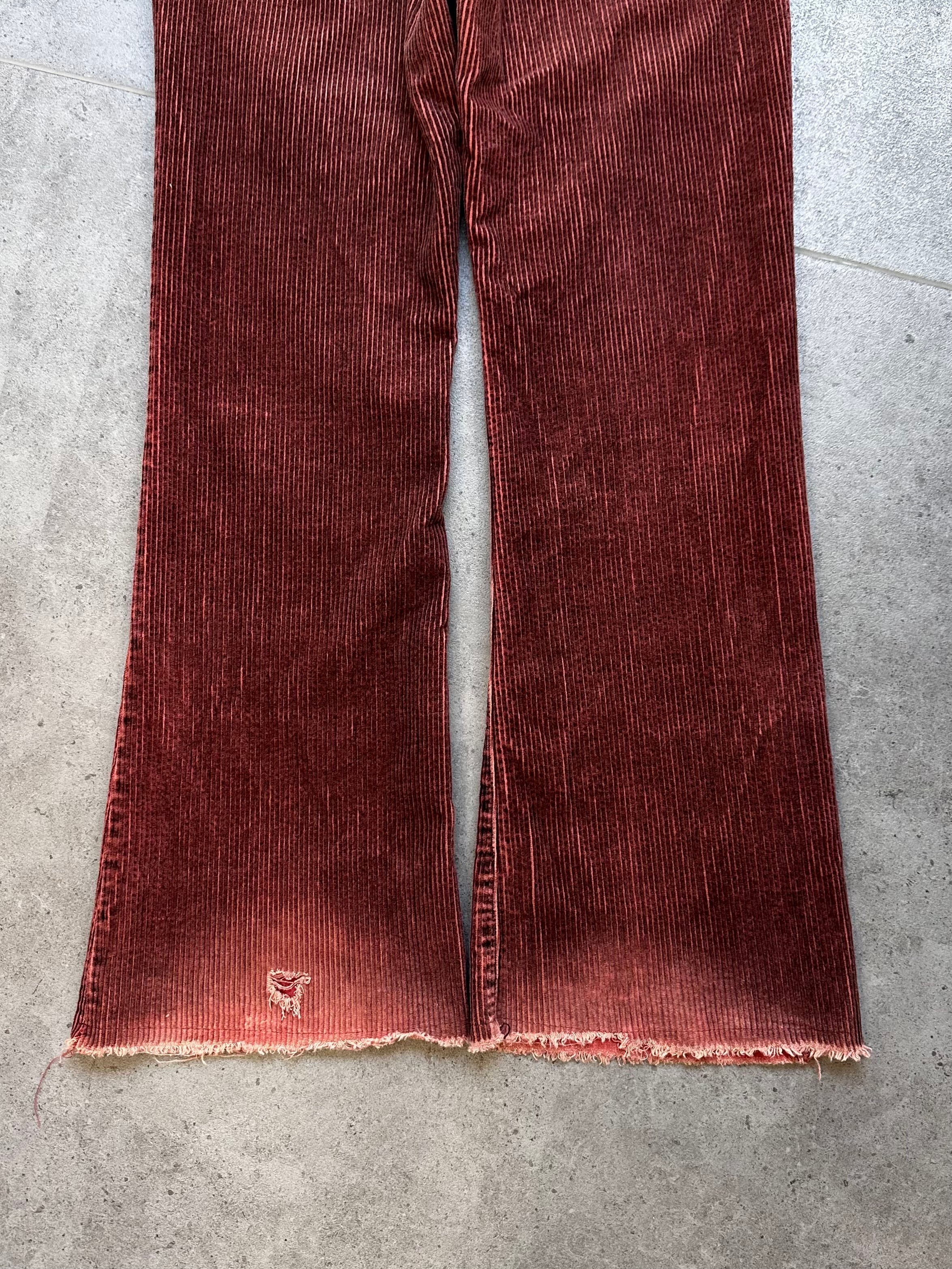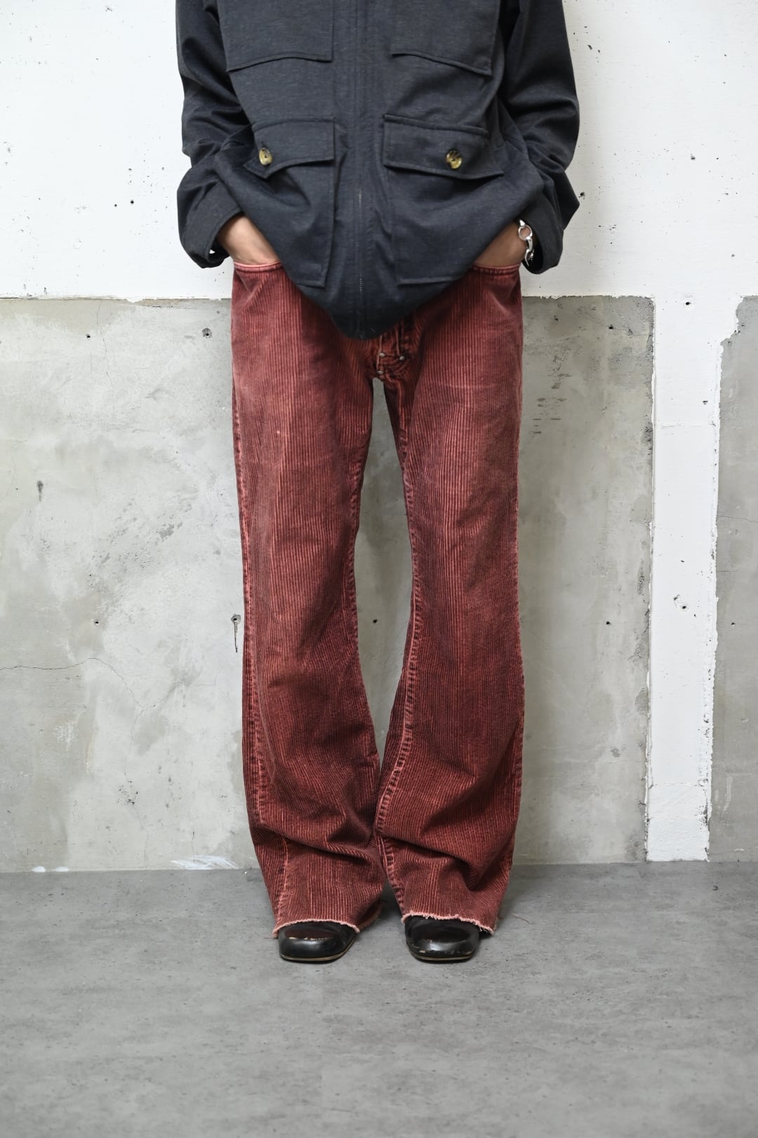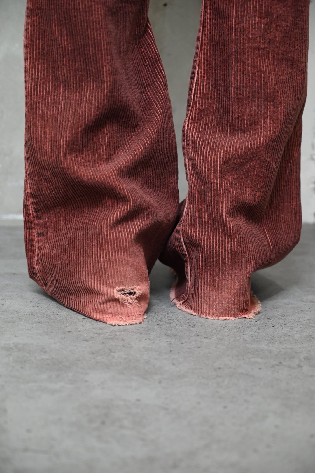 ブラウンがかった赤色が褪色した様な独特なカラーに柔らかなコーデュロイ素材の奥行きのある表情が魅力的なワイドフレアパンツ。