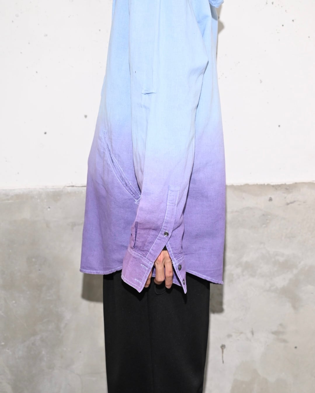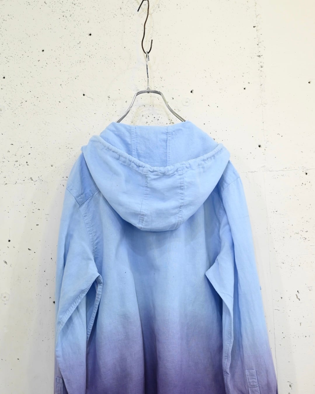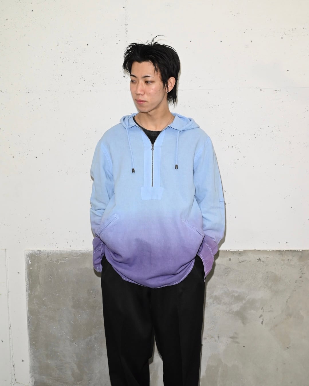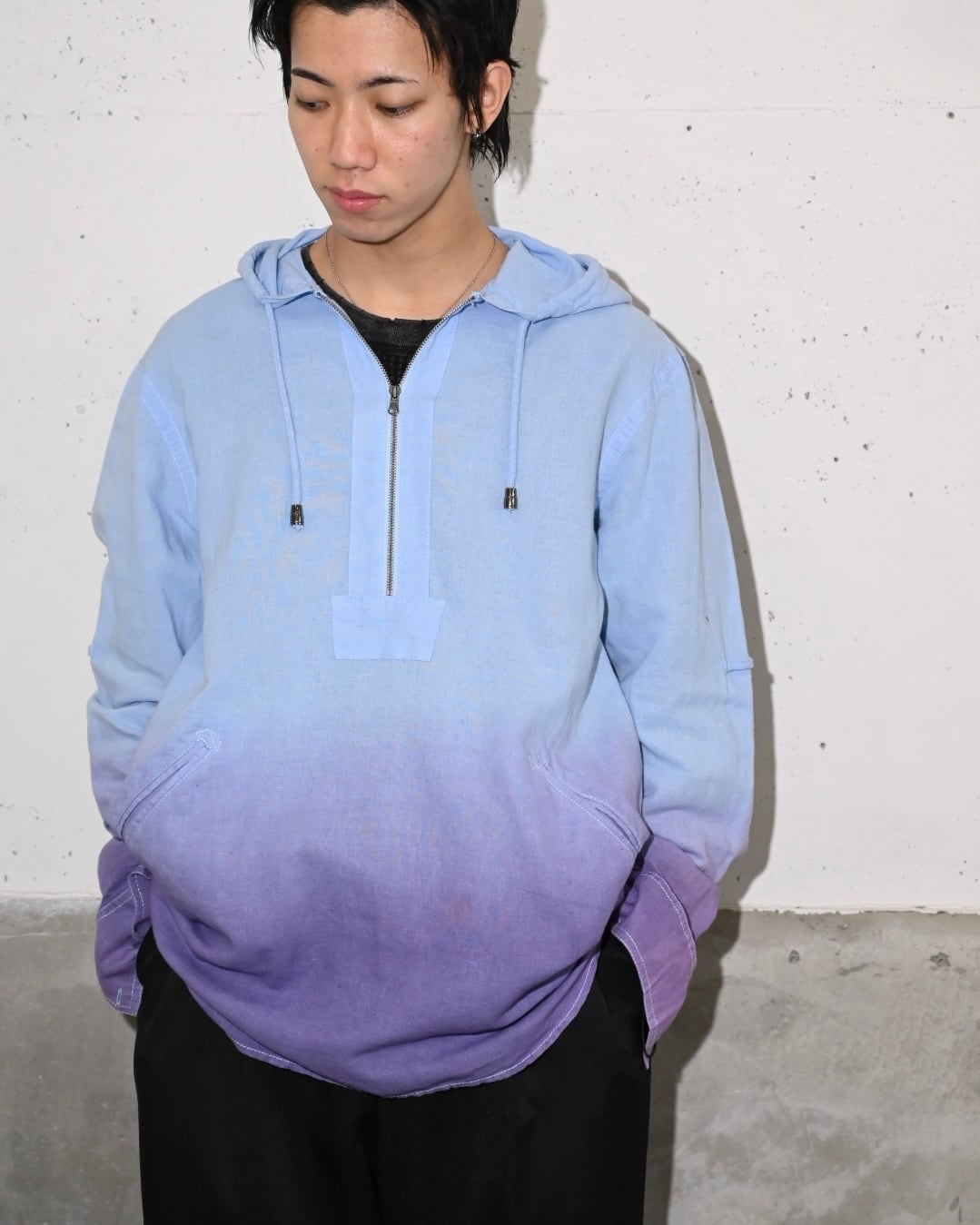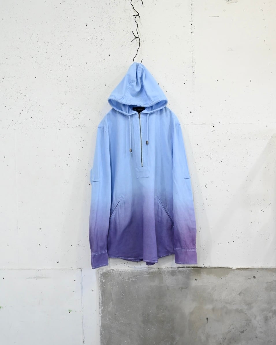 淡いブルーからパープルへのグラデーションが目を惹くハーフジップフードシャツ。