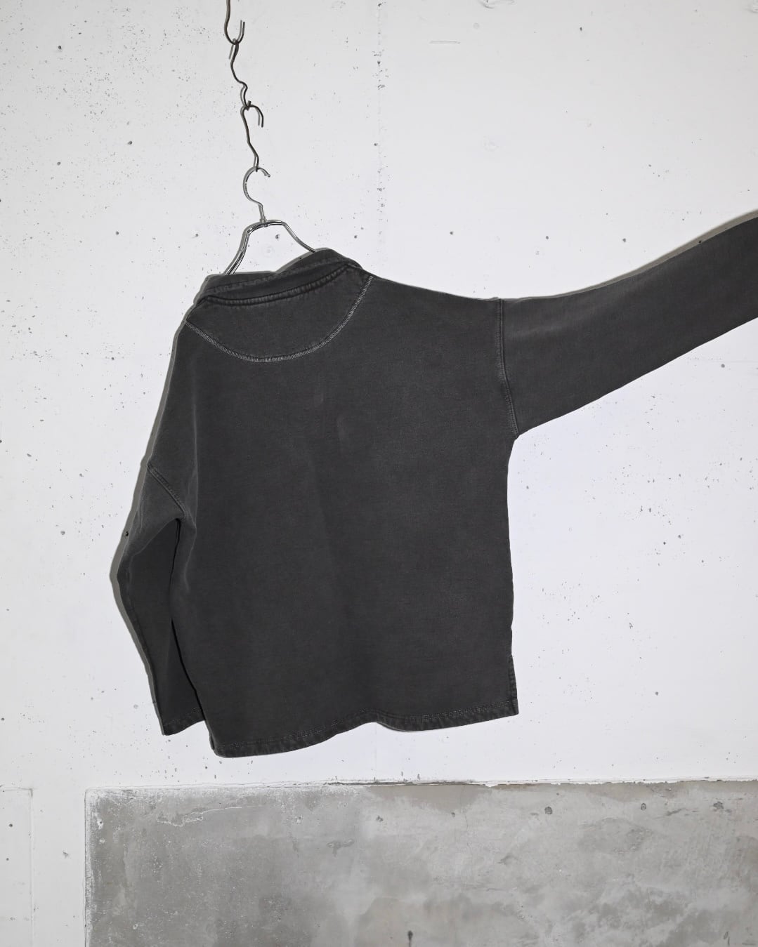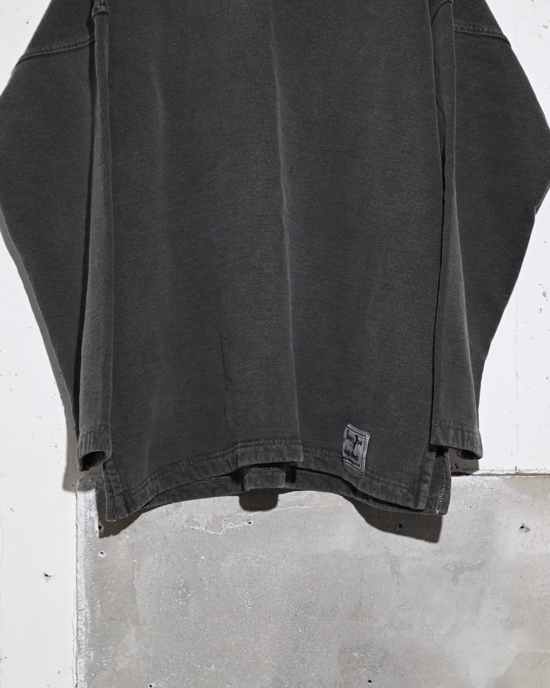 製品染め特有のムラ感とフェードした墨黒が雰囲気のあるスウェット。