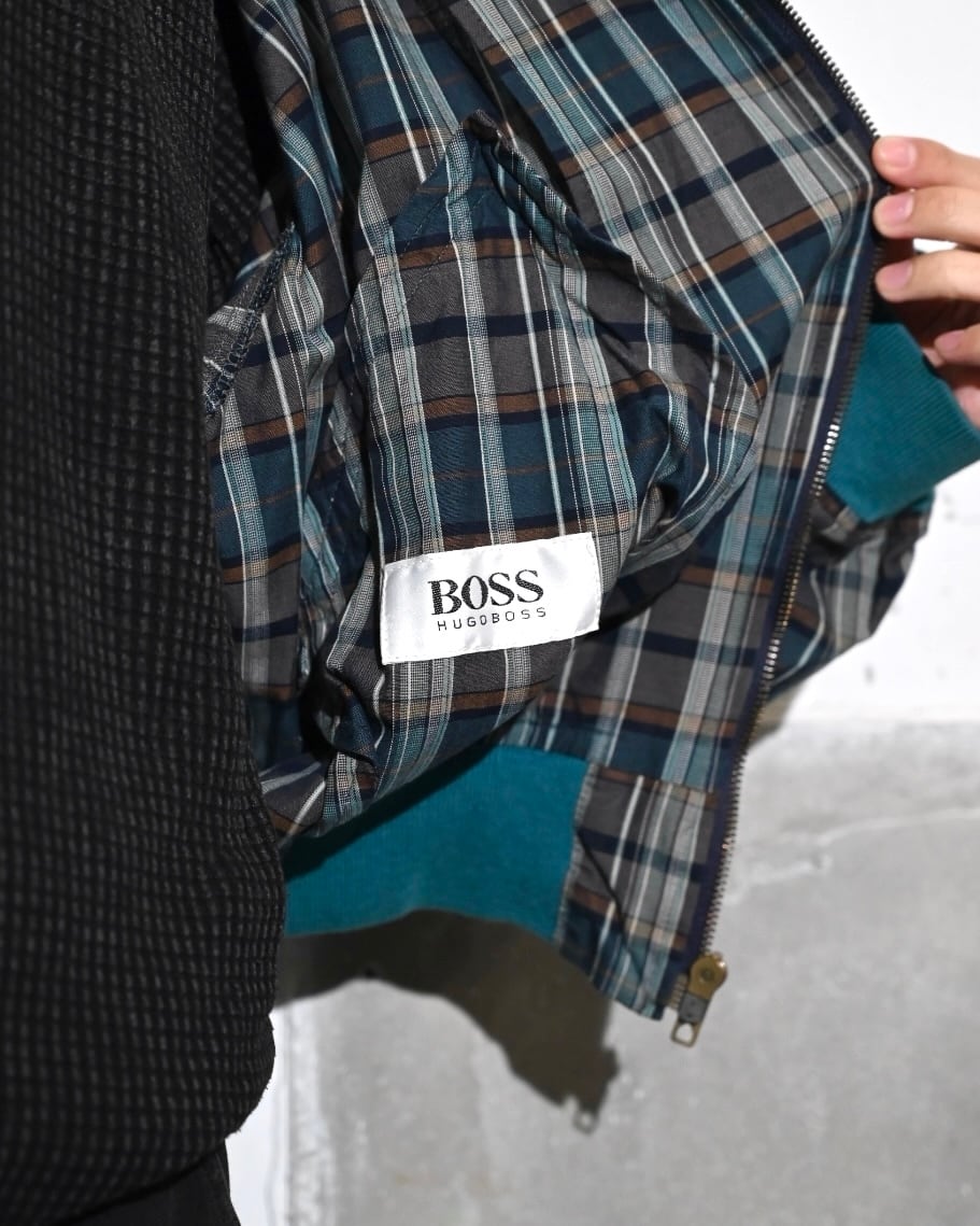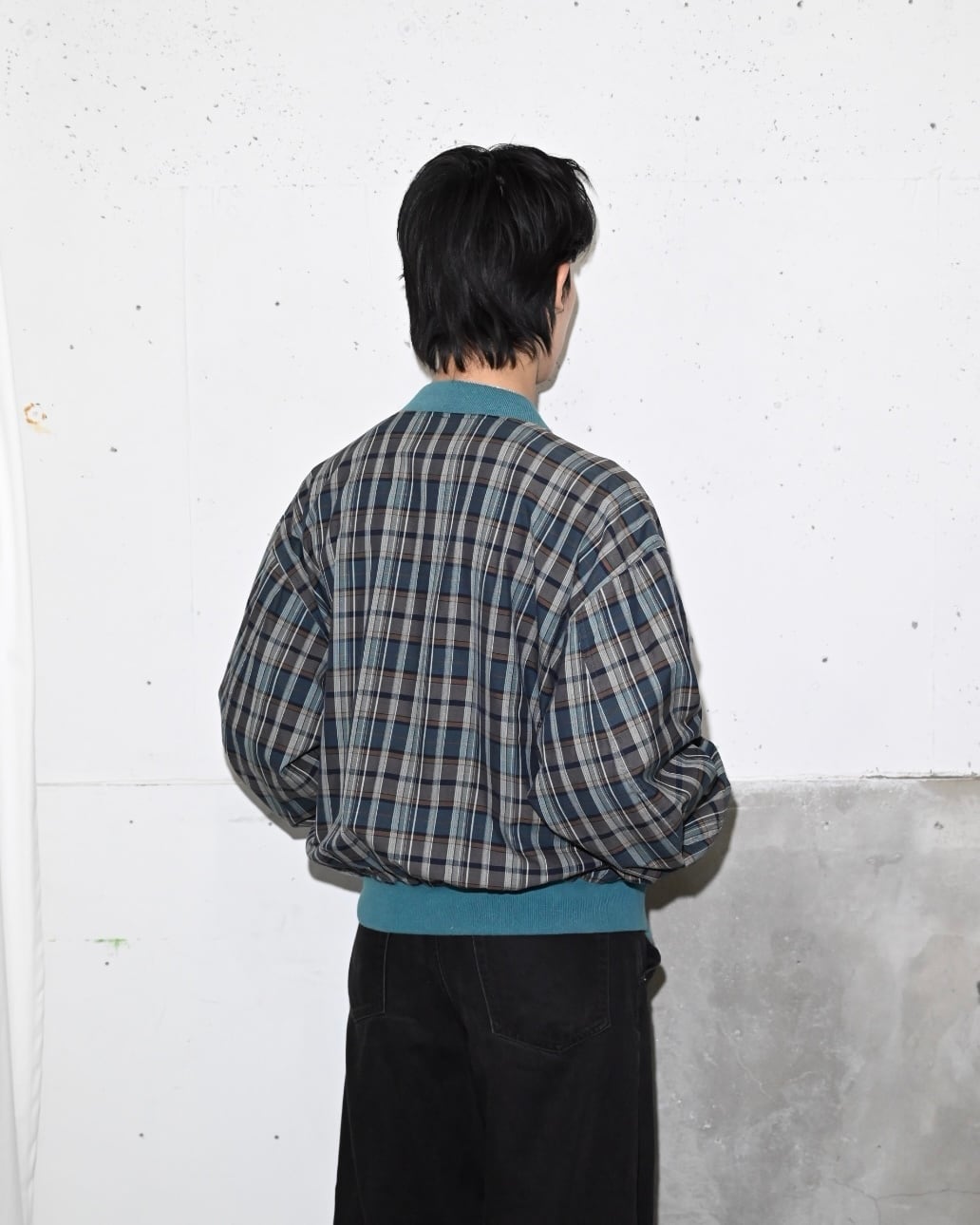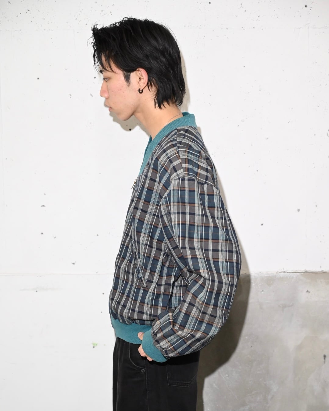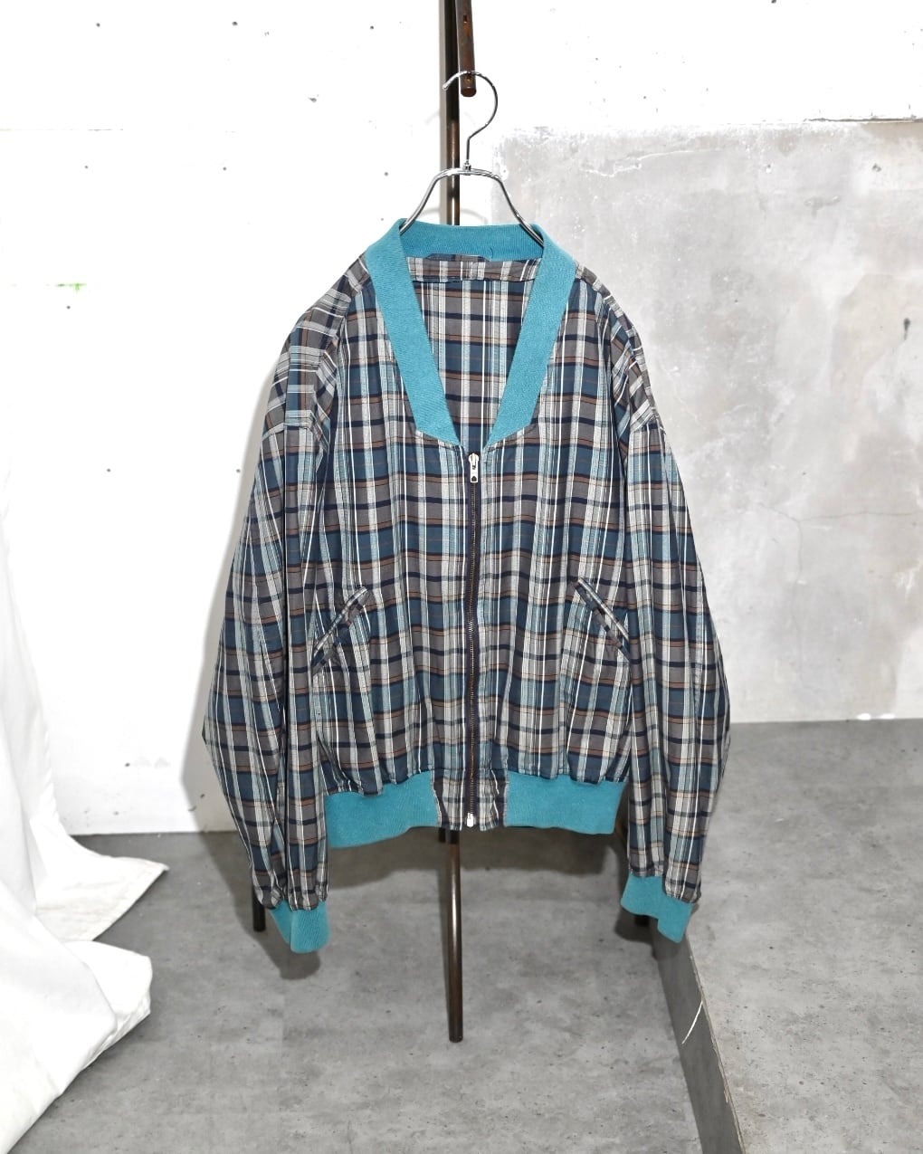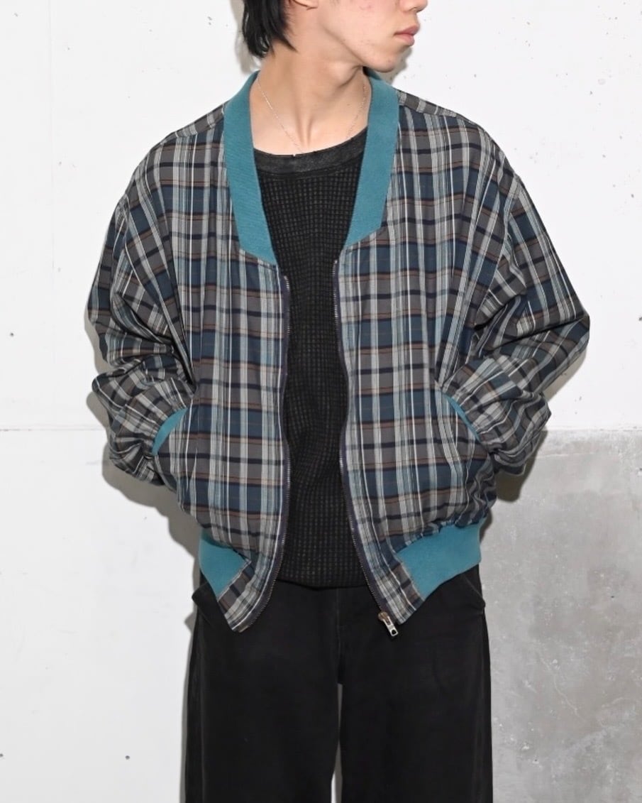 落ち着いたトーンのチェック地にターコイズブルーのリブがアクセントになったジップアップブルゾン。