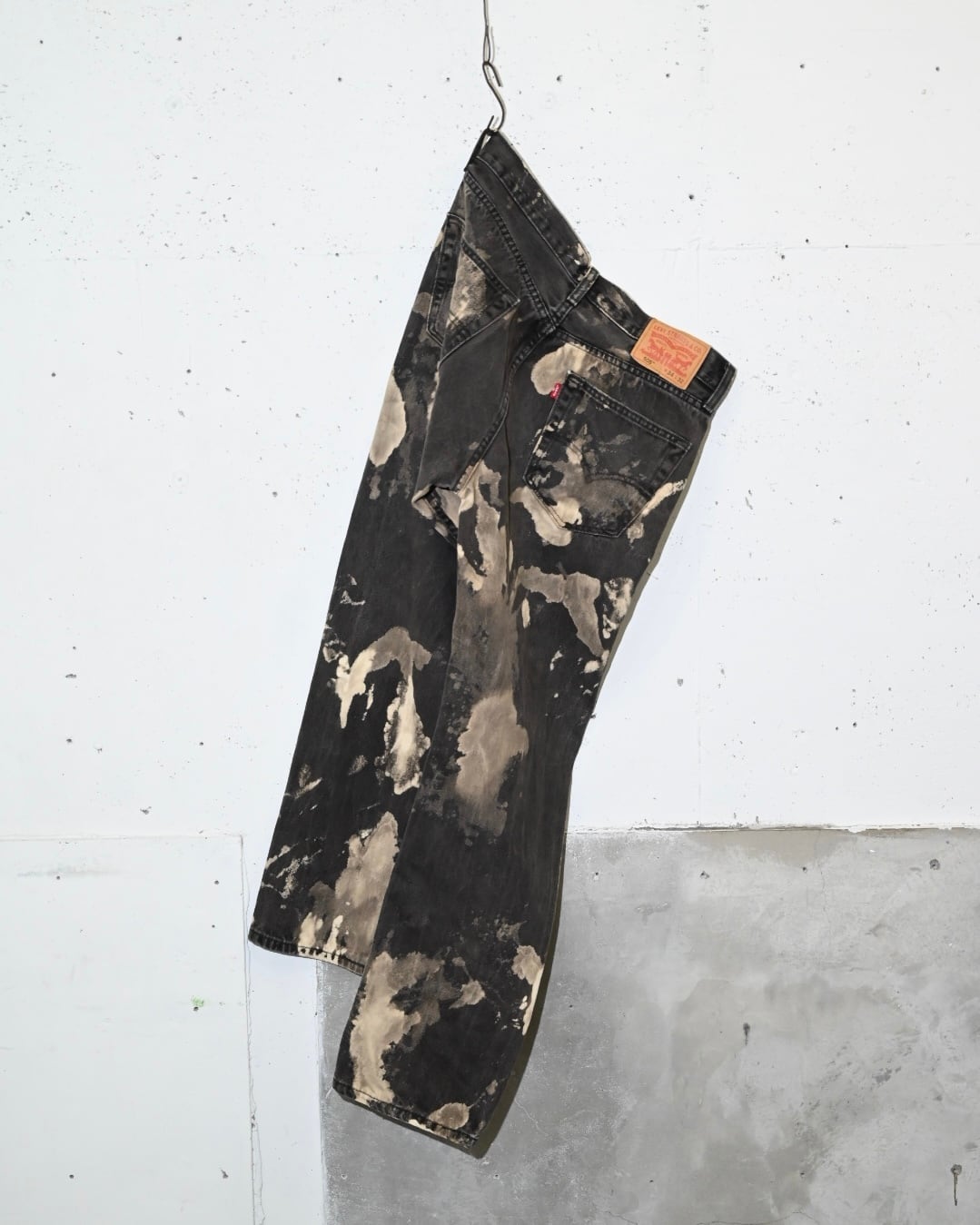 ブラックデニムをベースに、インパクトのあるブリーチ加工が施された一本。